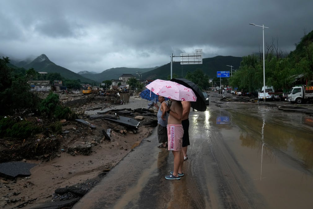 People look at a riverbank and road damaged by floods in the Mentougou district in Beijing