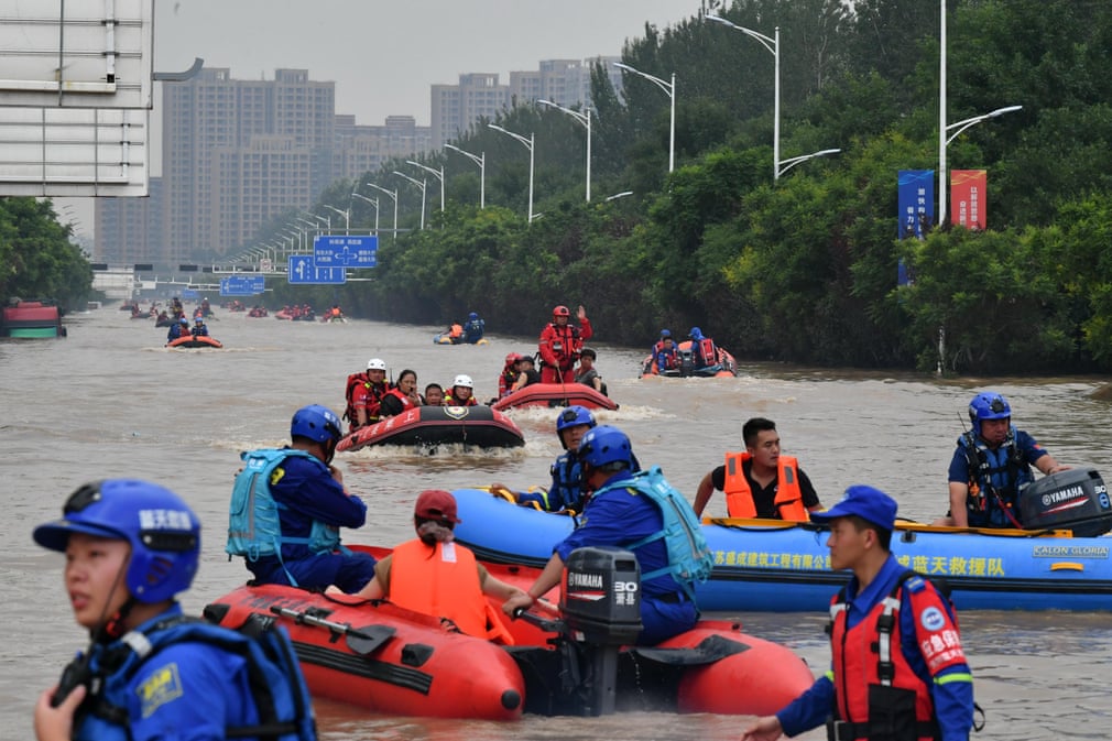 Rescuers transfer flood-trapped people in Zhuozhou City