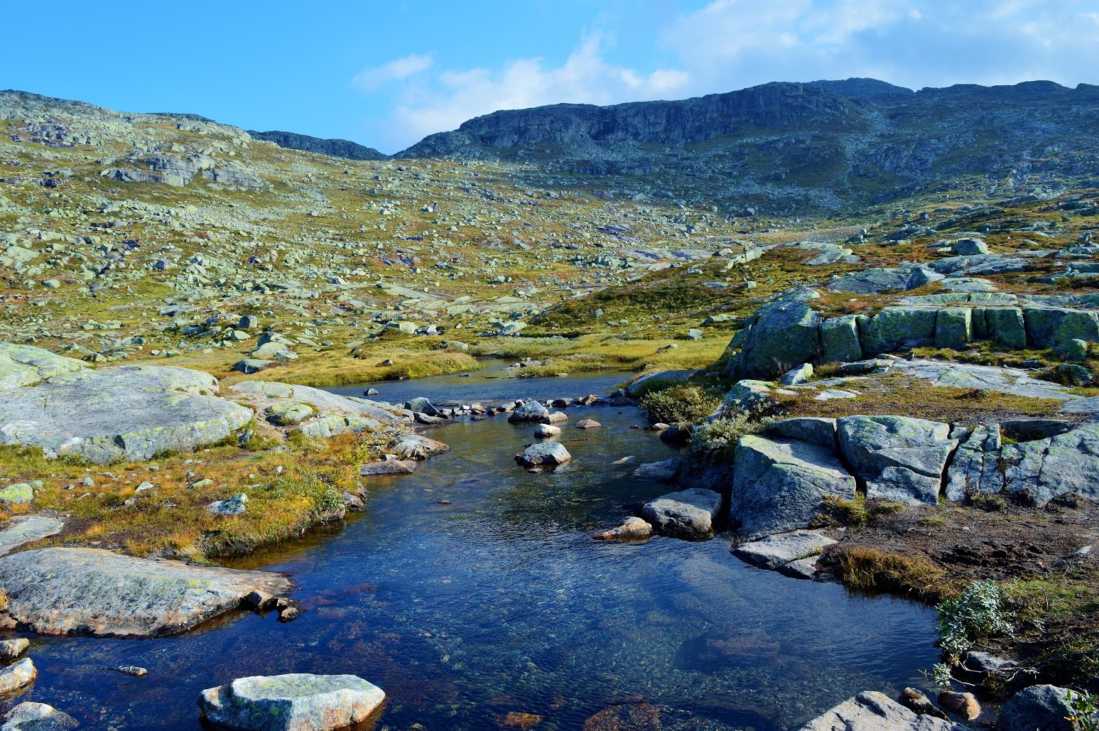 Every winter Norway fjords were topped by thick snow and ice cap, which keep melting away during entire summer and fall, watered streams and fed seasonal waterfalls. Snow coverage diminishes to its lowest level in September, time when I hike the trail. While I still see thin creeks along the way from glacier meltdowns, water is crystal clear.