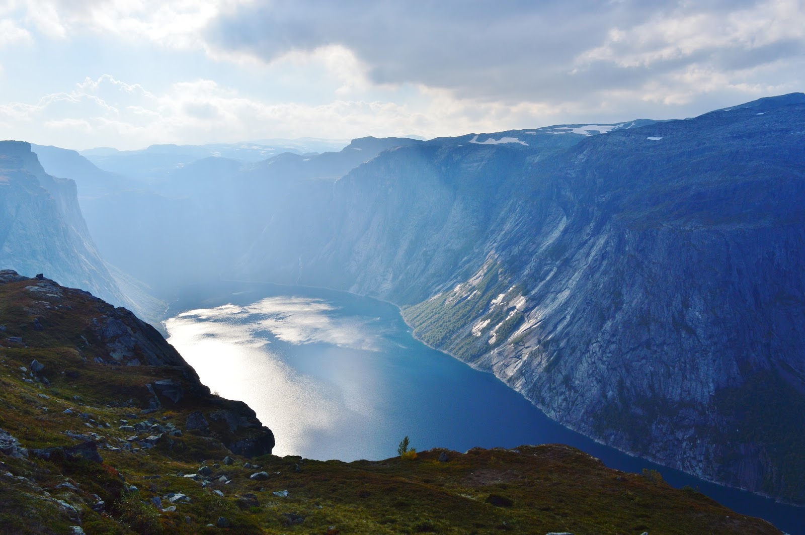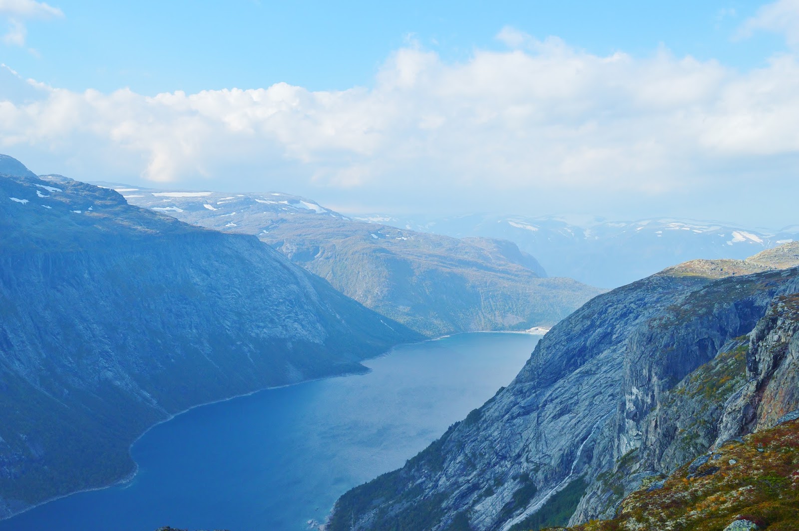 Standing at the tip of Trolltunga I was feeling incredible. Calm and tremendously beautiful blue water underneath my feet, scenic cliffs surrounded, and snowy mountains lining the background together formed a magic and dreamy view. I have seen many awesome landscapes before, but nothing quite like this. Perhaps sense of achievement added to the experience, too. For a moment there I feel time was frozen, world looks so vibrant, and the tough hiking was absolutely payoff :)