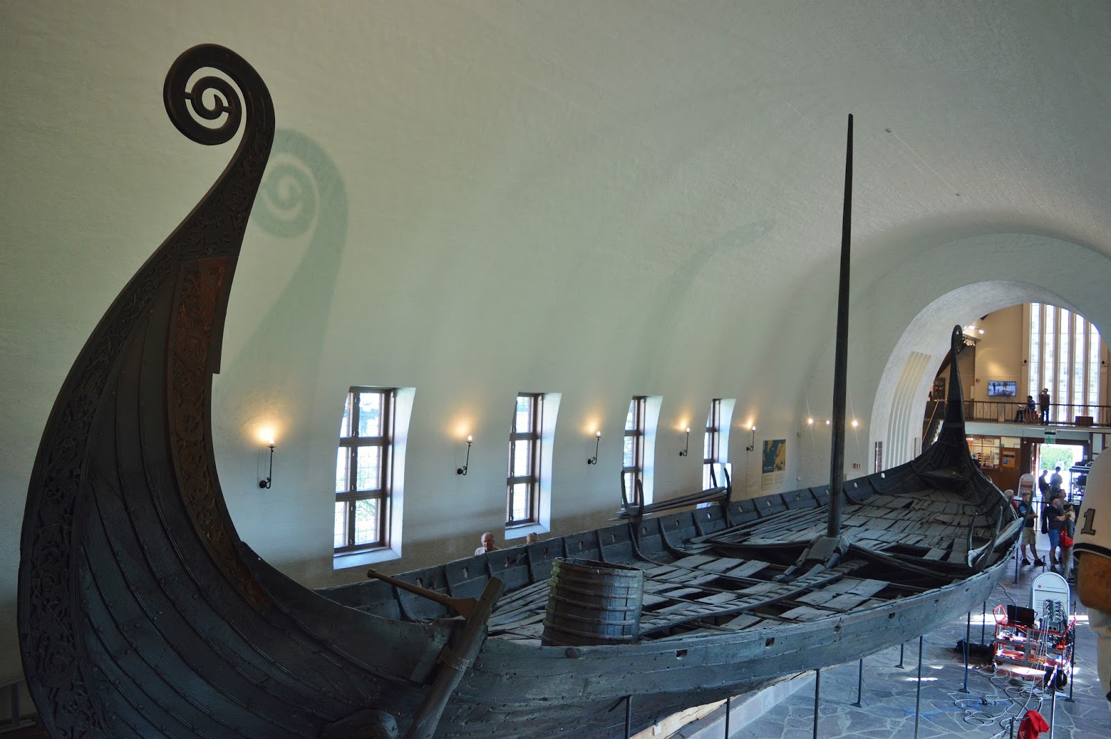 Ship building is vikings' most proud of skills. In Oslo I saw the astonishingly well preserved Oseberg ship, built around 815-820 AD, 22 meters long, all black, good for up to 30 oarsmen. The ship is invariably symmetrical, had identical tall curved prows on both ends. This structure enable the oarsmen move the ship forward or backward without a turnaround. Ship is beautifully carved from pow to the entire stern under waterline. The Oseberg ship is found in a large burial mound, together with bodies of two females, likely royalties. In any culture a rich funeral usually associated with buried most valuable treasure for the death; For vikings, ship is their treasure, is their soul.