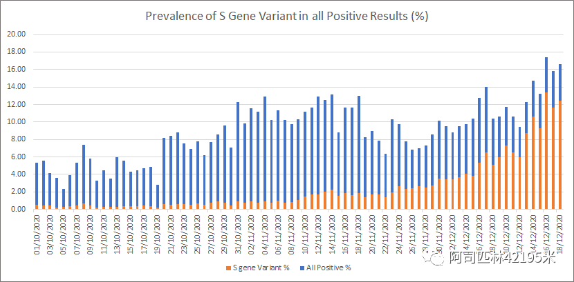 下面这张图是英国一个实验室10月1号到12月18号的的测试结果,金黄色的是突变病毒的百分比,可以看出这种病毒已经占领高地了。