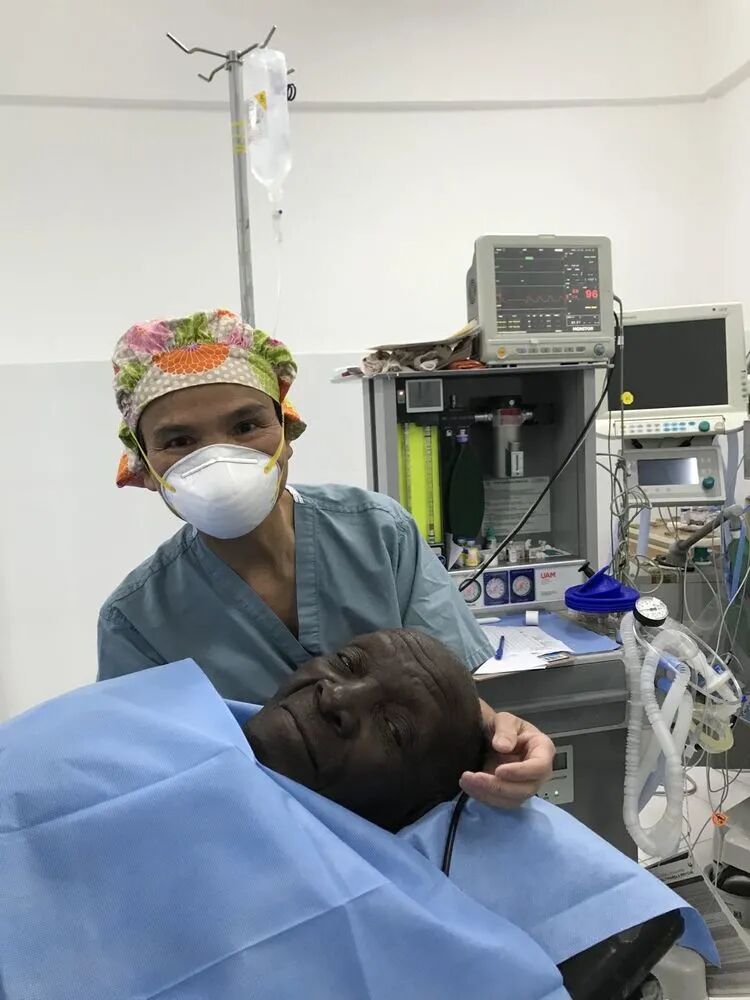 在所有的病人当中,只有这一位病人戴口罩。当我问病史的时候,他有咳嗽。这些症状在一周前开始,现在好了一些,但是仍然有些咳。一周前他曾经有一天觉得身体发热,可能是发烧了。可是没有看医生,也没有体温计可以量体温。除此以外,没有其它症状,周围的人也没有呼吸困难或上呼吸道感染的症状。我当时想,这有没有可能是COVID-19 啊?如果在美国,对于择期手术,我可能要推迟,并让并让去做一个新冠的检查。但是,在海地这个地方,检查显然不充分, 这个外科中心根本就没有能力做这项检查。