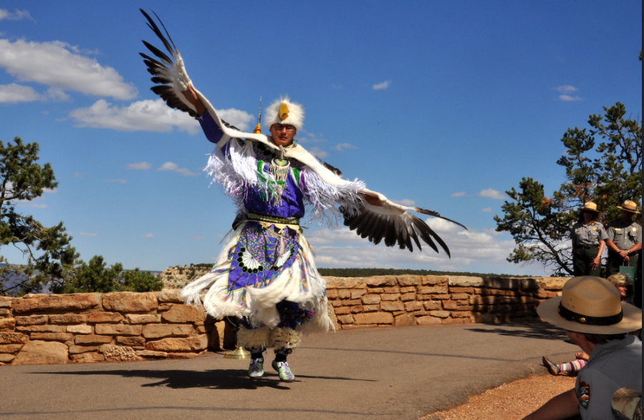 在大峡谷里举办的印第安人庆祝活动中,他们的头饰上居然也画了五只颜色各异的鸟。