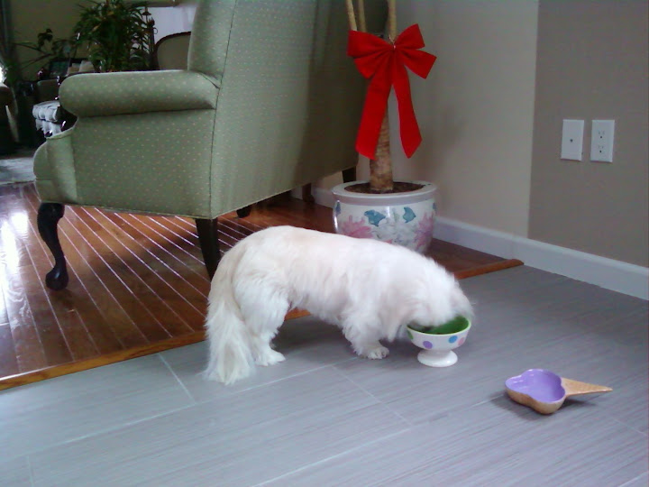 小东西刚刚吃了点鸡肉拌狗食。 有点劲了: