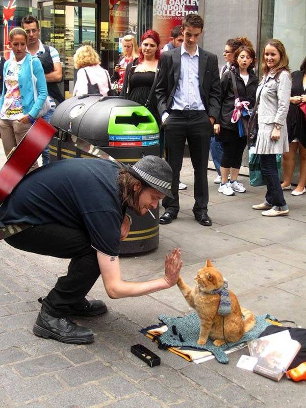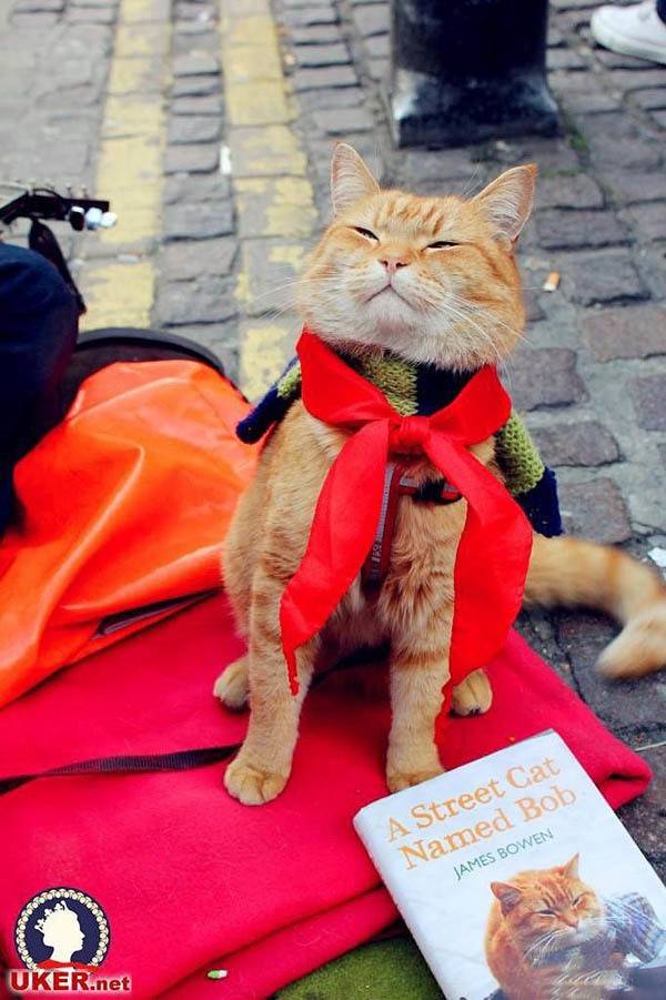 在伦敦的一条大街上,来往的英国民众和游客熙熙攘攘,不时传来吉他的声音。人们已经习惯了这条街上的常客:背吉他的詹姆斯·波文和流浪猫鲍勃。詹姆斯负责唱歌,鲍勃负责静静地坐在旁边微笑,如果高兴,它就跳上吉他与詹姆斯共唱一曲。唱完歌后,他们还会击掌庆祝。