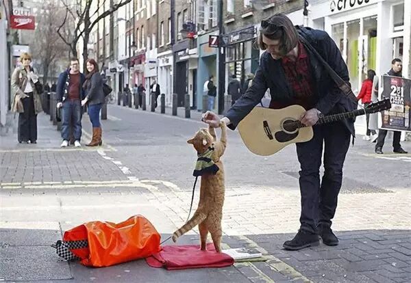 他们很快成了相依为命的朋友,一起卖艺,一起散步,一起对抗生活的困苦,一起享受努力的成就与幸福。就在鲍勃成为詹姆斯卖艺的“嘉宾”后,詹姆斯人气高涨,一天的收益差不多是此前的3倍。鲍勃以它与生俱来的灵性和不可思议的影响力,为詹姆斯带来了许多善良的关怀。而詹姆斯也靠着顽强的毅力和鲍勃不离不弃的陪伴,终于戒除了毒瘾,并逐渐步入正常的生活轨道。