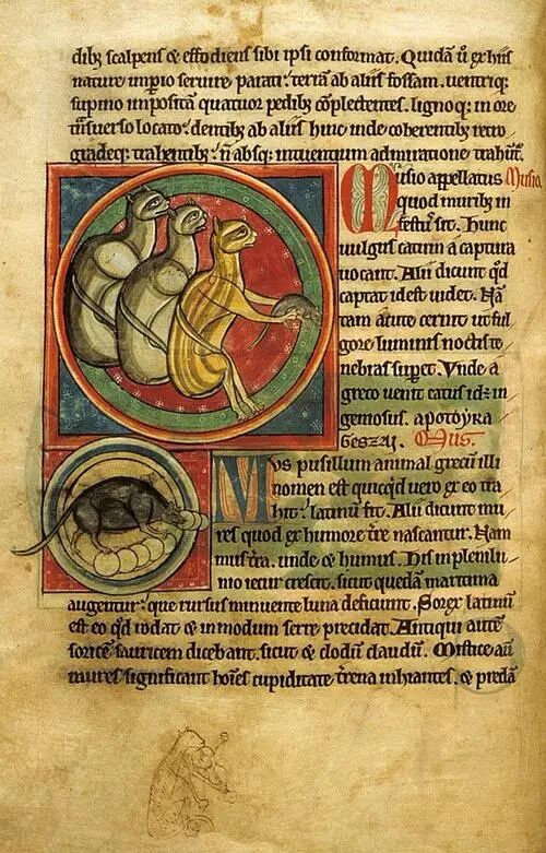 在中世纪手稿中,猫就扮演着猎手的角色(页脚还有抄写员涂鸦的猫)。画中的猫肌肉发达,身形矫健,与毛团状的现代宠物猫截然不同。图片来源:http://www.douban.com/note/319161107/