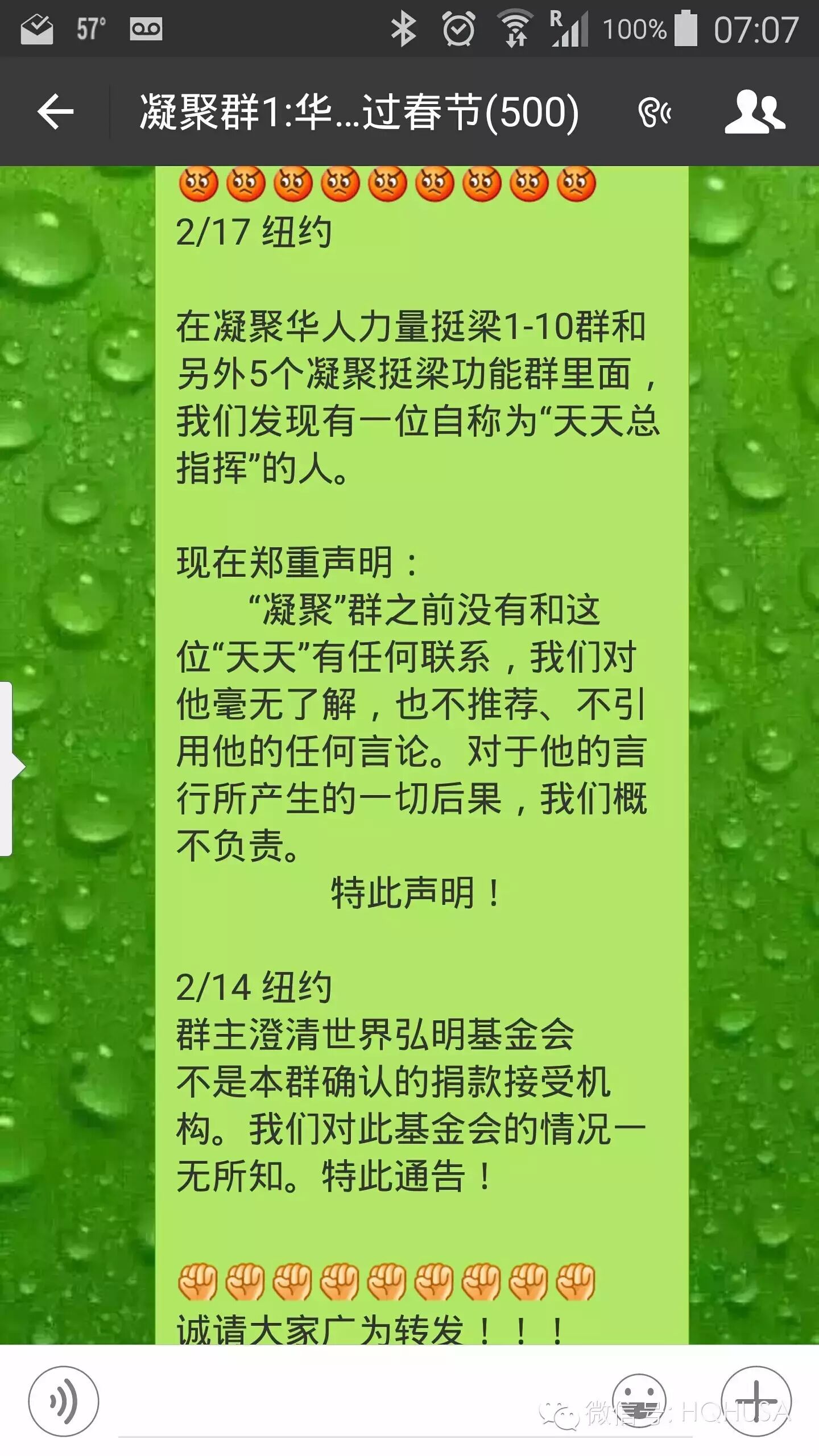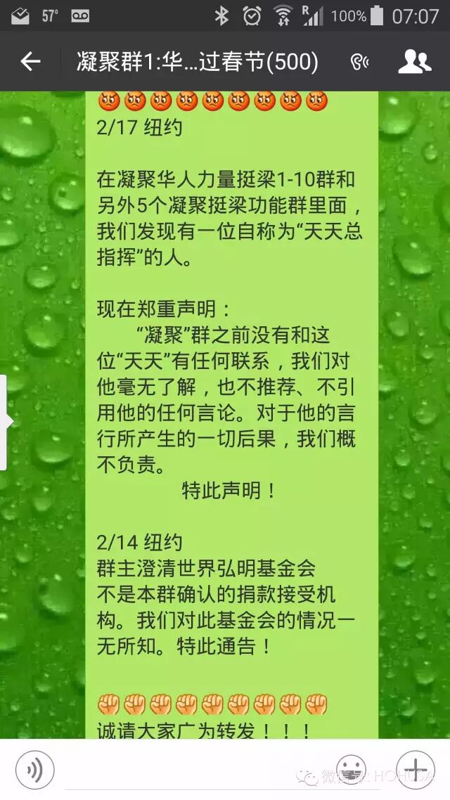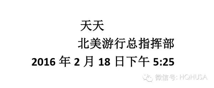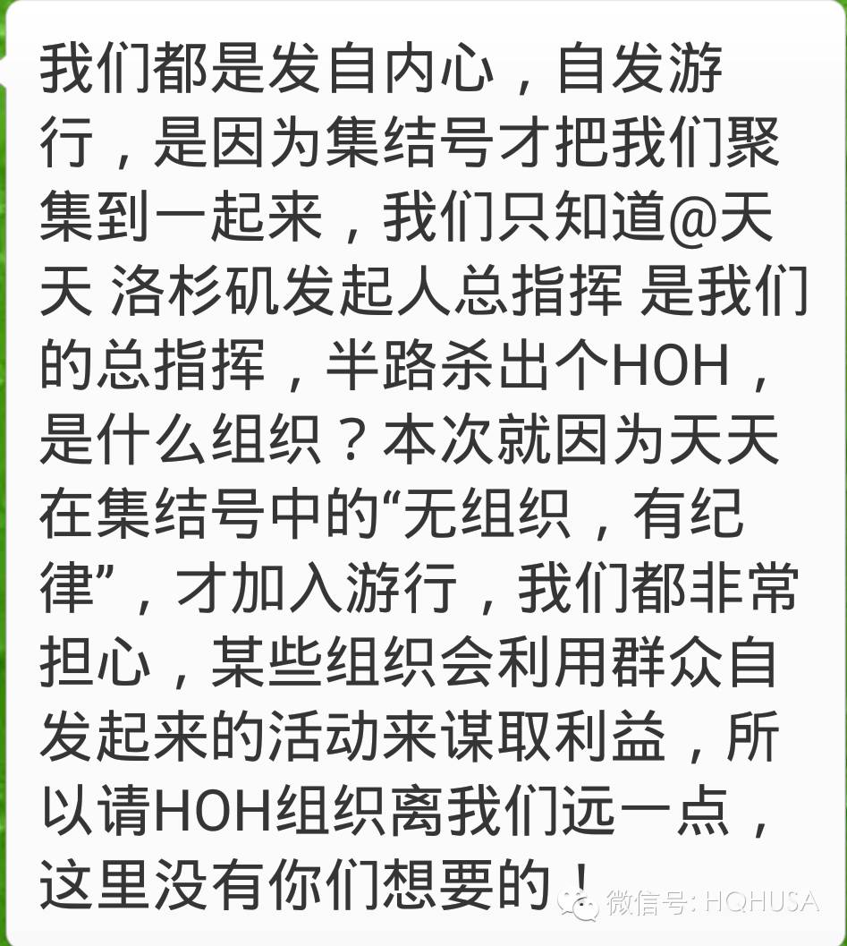 现在微信上谣传,凡是游行不听号称“全美2.20游行总指挥天天”的,就是不团结华人,奥巴马也不敢这么霸气吧?此人被纽约的所有凝聚挺梁群发布通告再通通踢了之后现在又叫“北美游行总指挥”了。