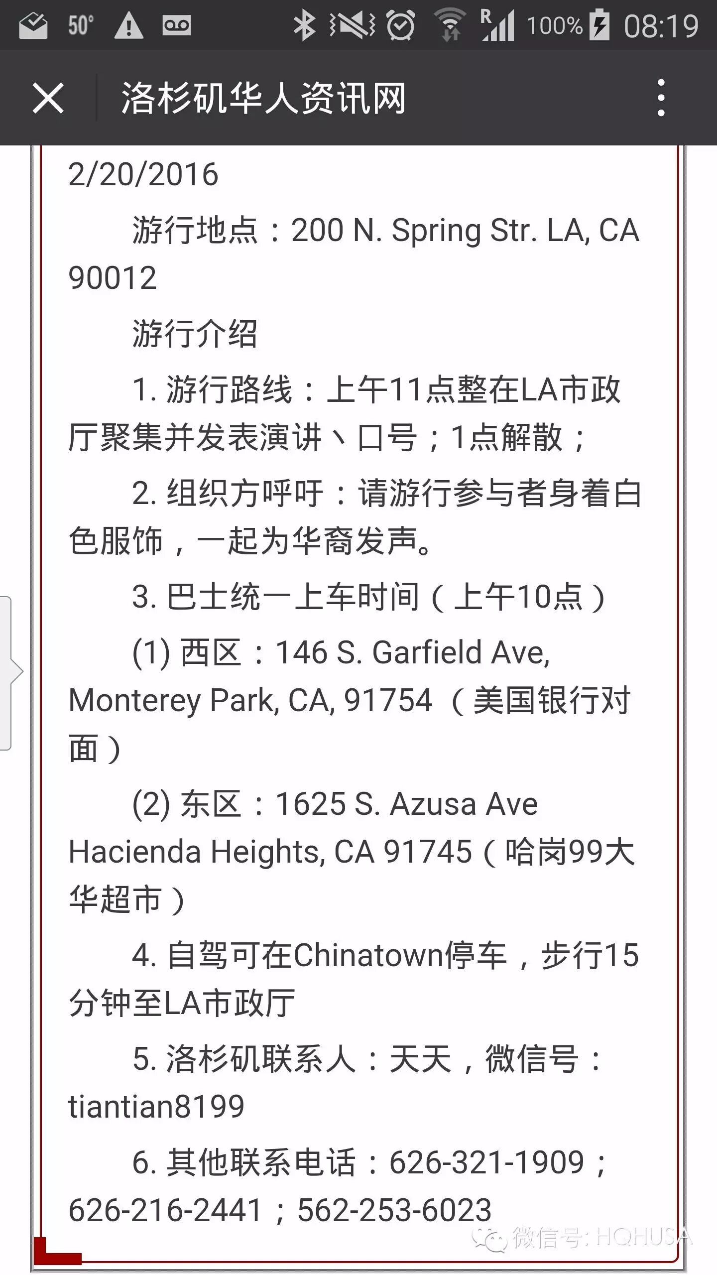 洛杉矶2月20日游行具体时间周六中午11点-1点;