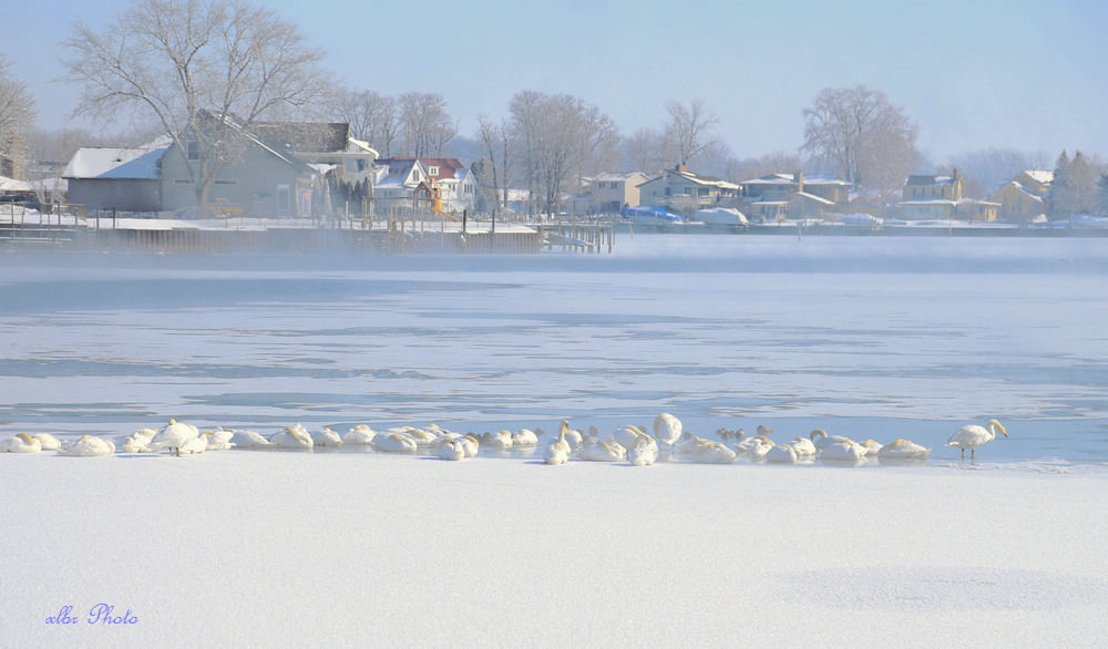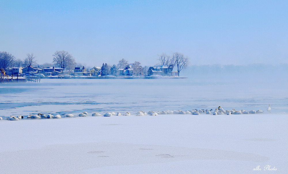 这个白雾白湖白天鹅的俺最喜欢:))最喜欢5b,这几只trumpeter swan一起叫,象几只破喇叭:),