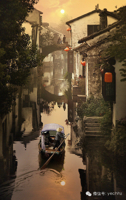 朱伞青衣乌篷,白墙灰瓦红灯,薄雾清风路人,涟漪惊晨,梦中人现红尘。