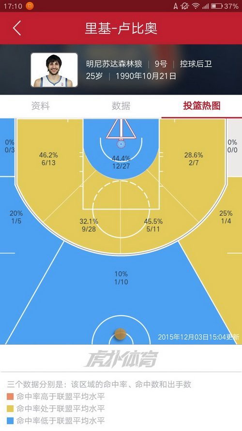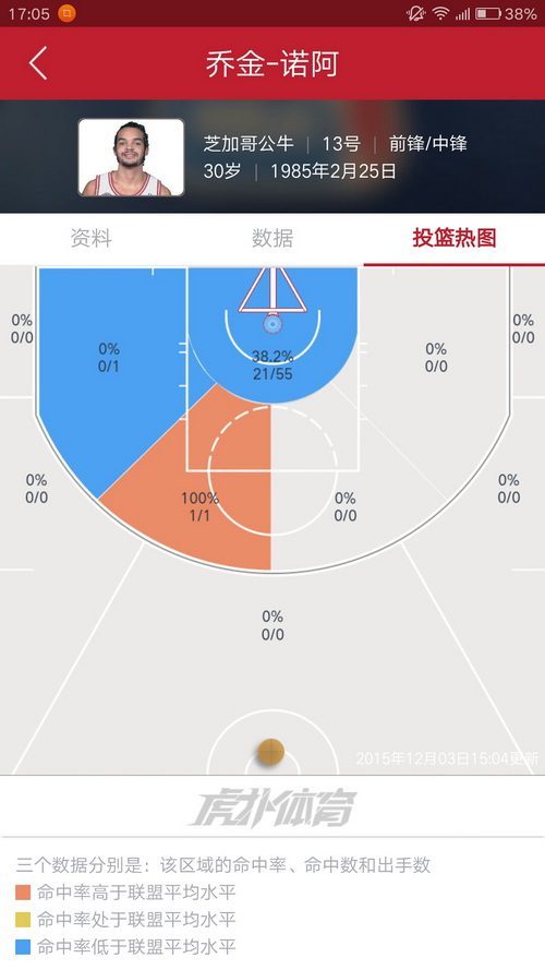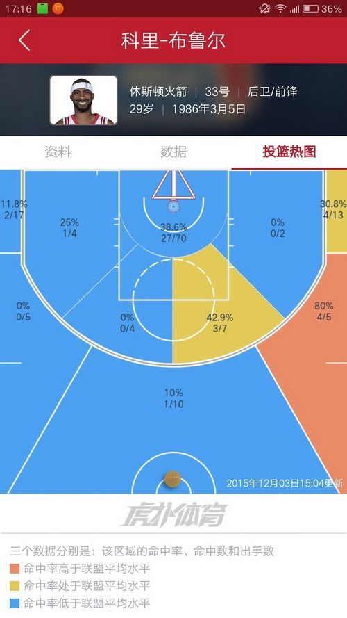 3.布鲁尔,这赛季命中率简直了,看看这一圈蓝色区域就知道了。咦?他竟然还有一个红色区域,还记得那次对开拓者的超远三分扳平吗?