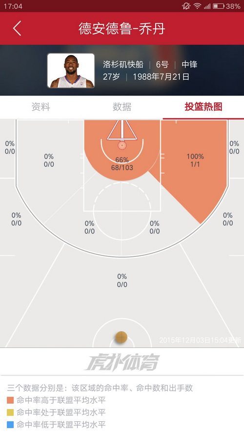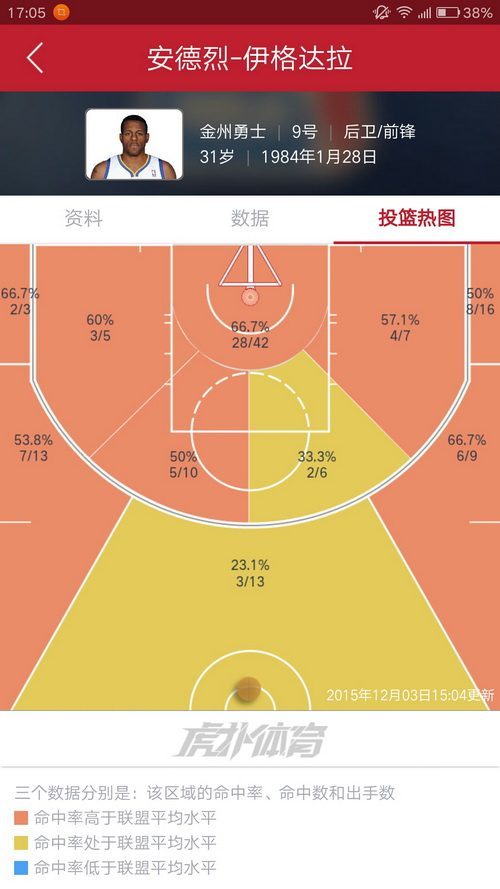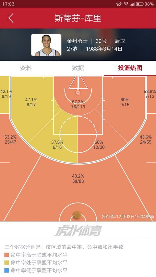 4.库里,库日天实在是太变态了,一片全红,最差也有37.5%,三分线外更是没有低于42%的区域