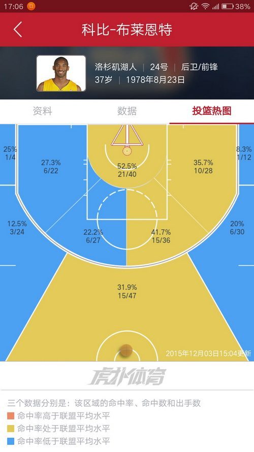 10.科比,老大真是老了,除了篮下,只有一个区域命中率过了40%