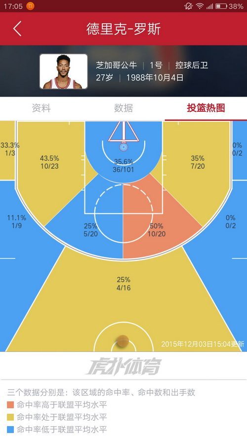 7.罗斯,当年的MVP,顶级突破手罗斯,如今只有一个区域是红色,三分线外惨不忍睹,连篮下命中率也只有35.6%