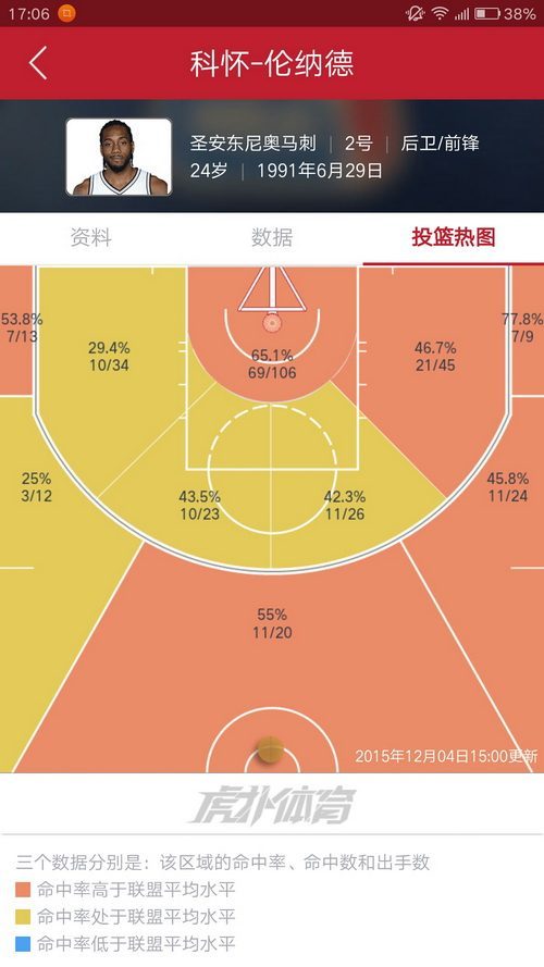 9.伦纳德,伦纳德今年大爆发,热区只有4个区域不是红色,看看他两个底角的三分,能吓死你
