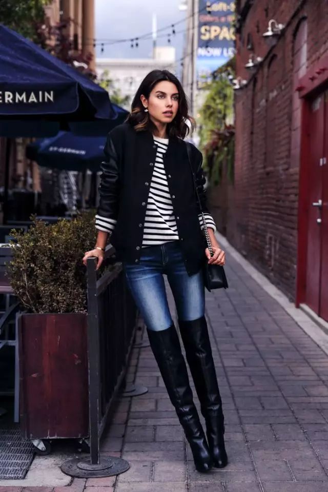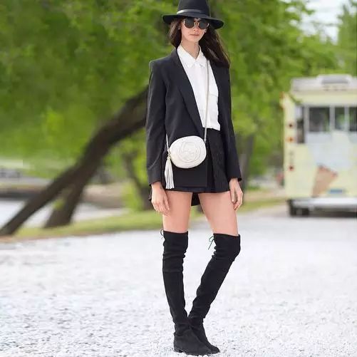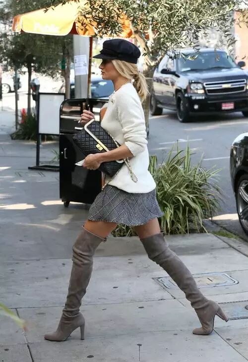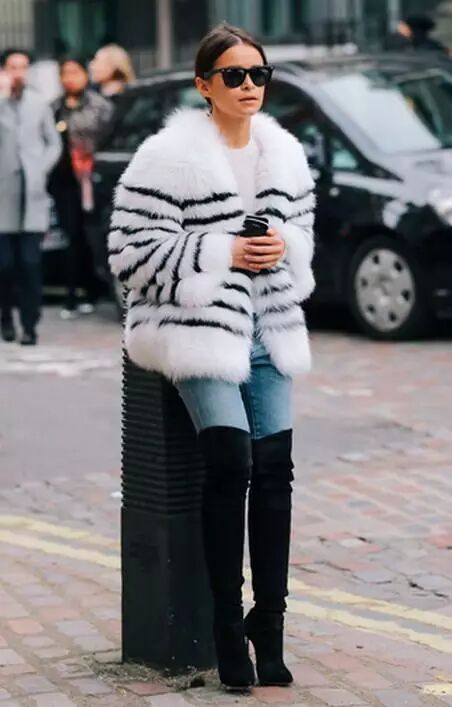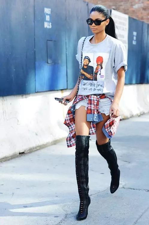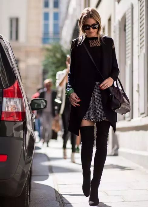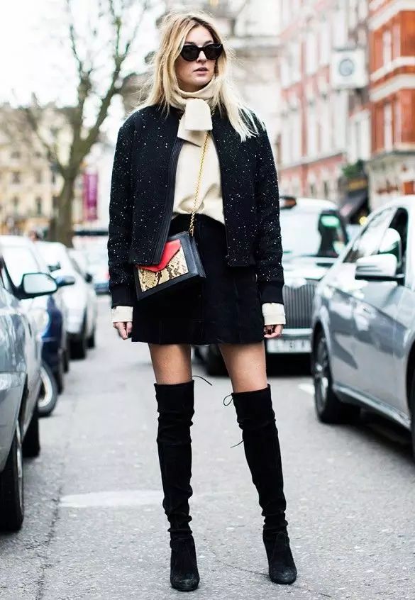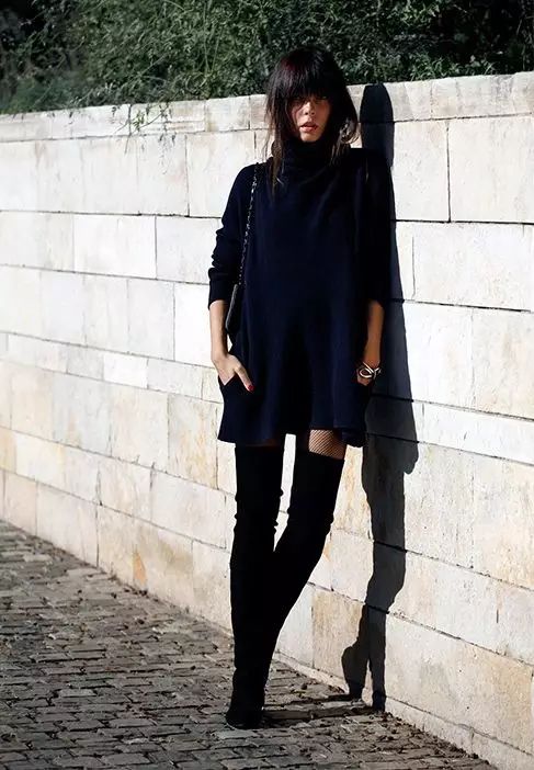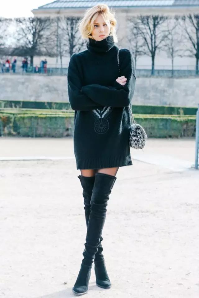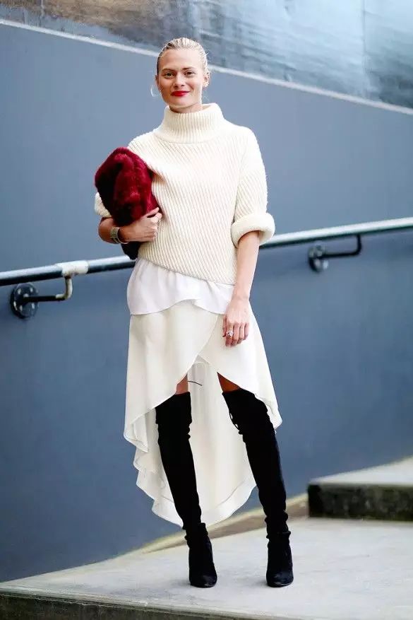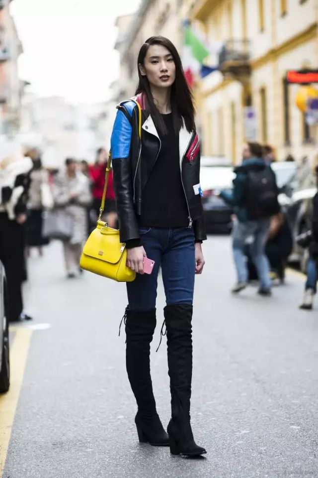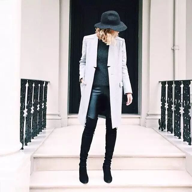 过膝靴的搭配无非就两种,一种是上面这种光腿的,另一种就是穿在紧身裤外,一样勾勒出女人的曲线。但都要注意一点:less is more。过膝靴已经给了你明晃晃的嚣张和性感,切勿再堆积其他繁琐元素。
