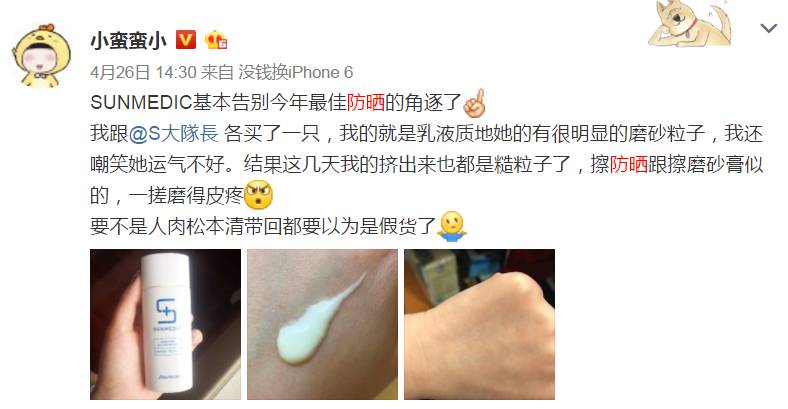 然而,她作死的品控出了问题,很多人(包括我和基友S大队长)都反馈里面有磨砂粒子,知道的是在擦防晒,不知道的还以为在用身体磨砂呢!