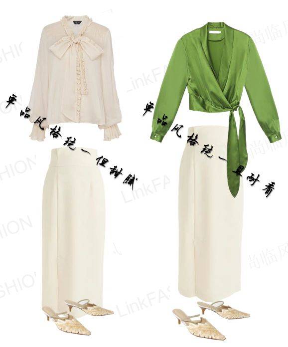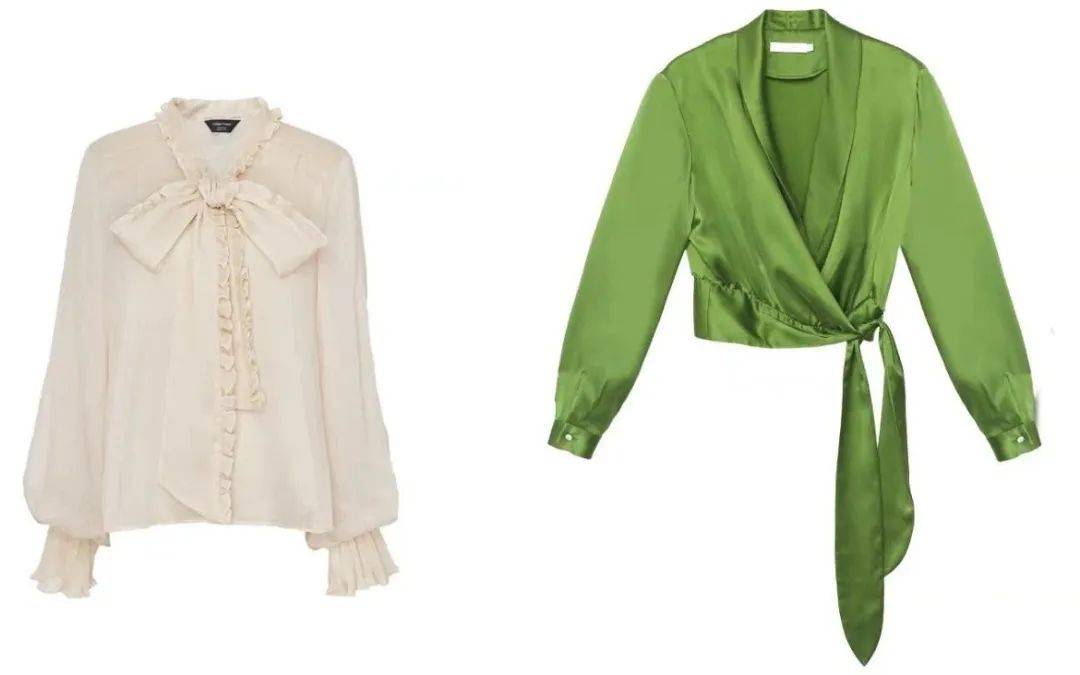 因为风格的基础是单品本身,以及你如何组合。我们来对比一下以下两件衬衫,虽然同为女性化风格明确的款式,但在设计元素上有差别。