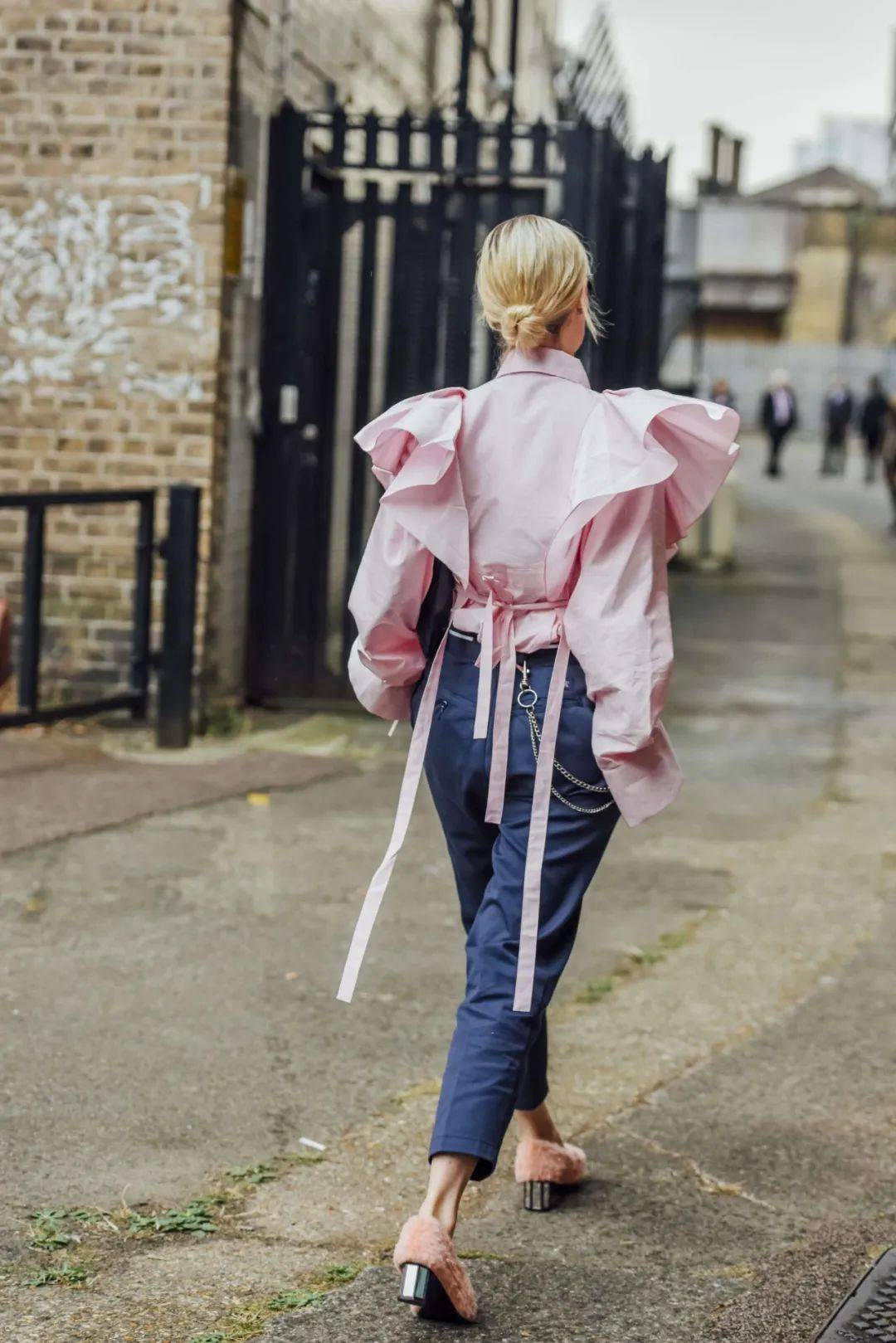 第一件荷叶边蝴蝶结雪纺泡泡袖各种柔美元素堆砌,本身风格属性已经很强了~如果再搭配铅笔裙、尖头鞋就会显得异常甜腻。
