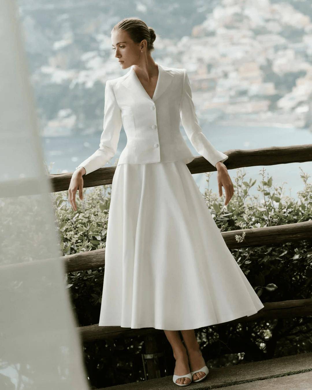 白色西装+伞裙:奶油白西装与同色伞裙组合,通过廓形对比突出轻盈感,搭配白色高跟鞋延伸视觉,适合小个子穿出俏丽文艺气质。