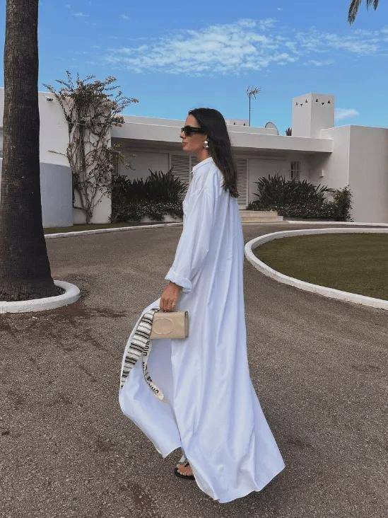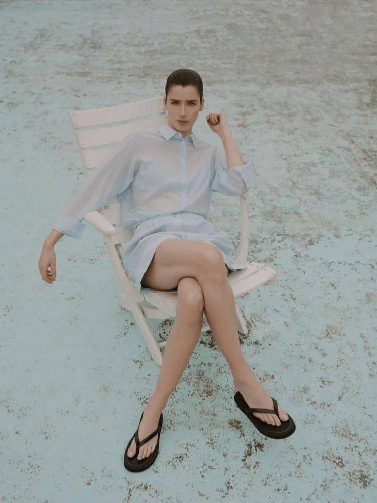 衬衫连衣裙是秋日松弛感的满分答案。及膝长度配合腰间微收设计,搭配一双黑色人字拖凉鞋,以黑白对比强化视觉张力。无需复杂配饰,一只帆布包或皮质托特袋即可点缀出漫不经心的精致感,从容应对从办公室到街角的场景切换。
