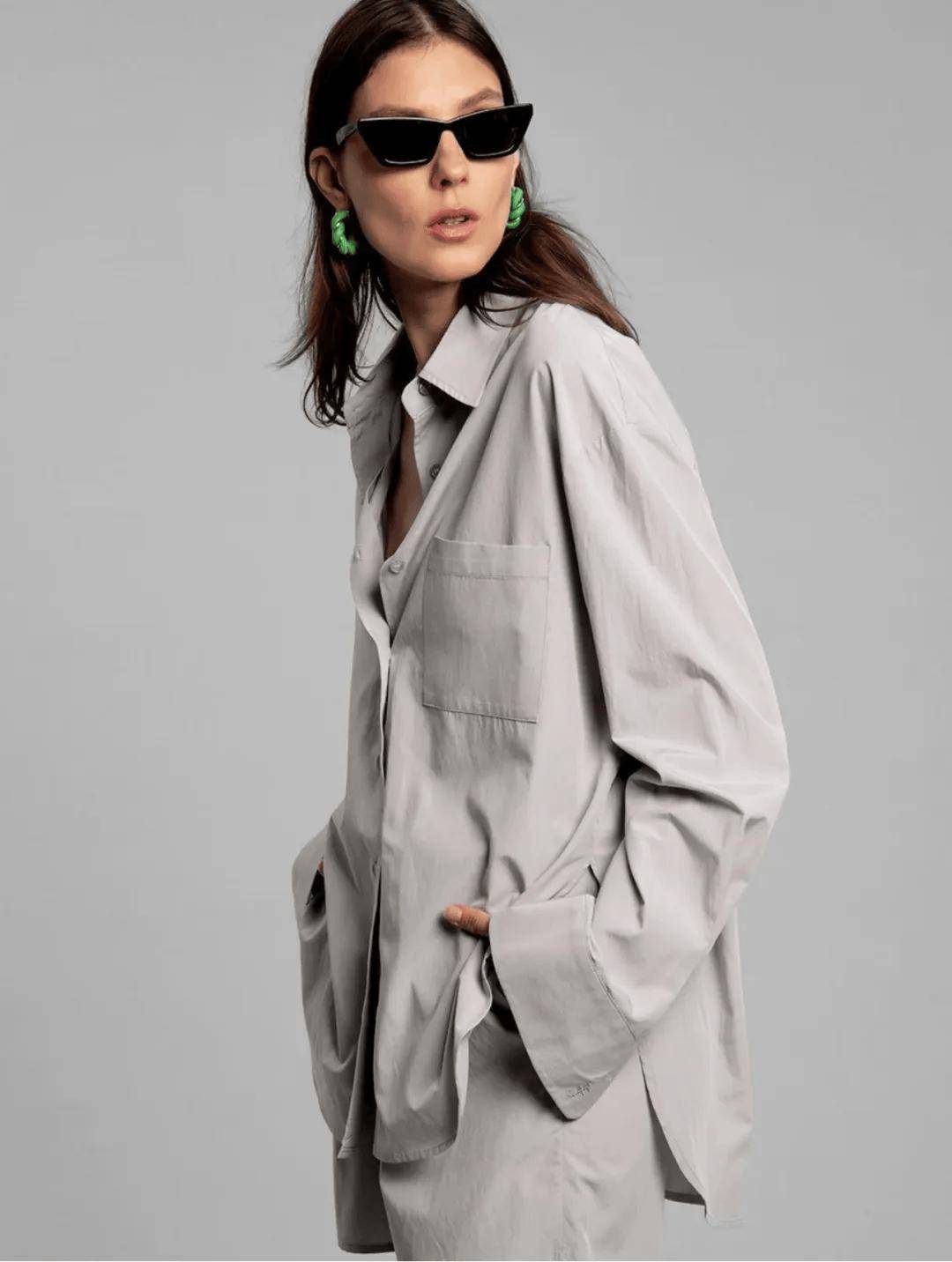 宽松的灰色衬衫自带慵懒气息,搭配一条垂感十足的咖色阔腿裤,无需刻意修饰身形,仅将衣角半塞入腰间,便能拉长比例、增添随性层次。面料与色彩的碰撞,让极简单品瞬间拥有温度与故事感,适合通勤或午后咖啡馆小憩,于低调中彰显智性魅力。
