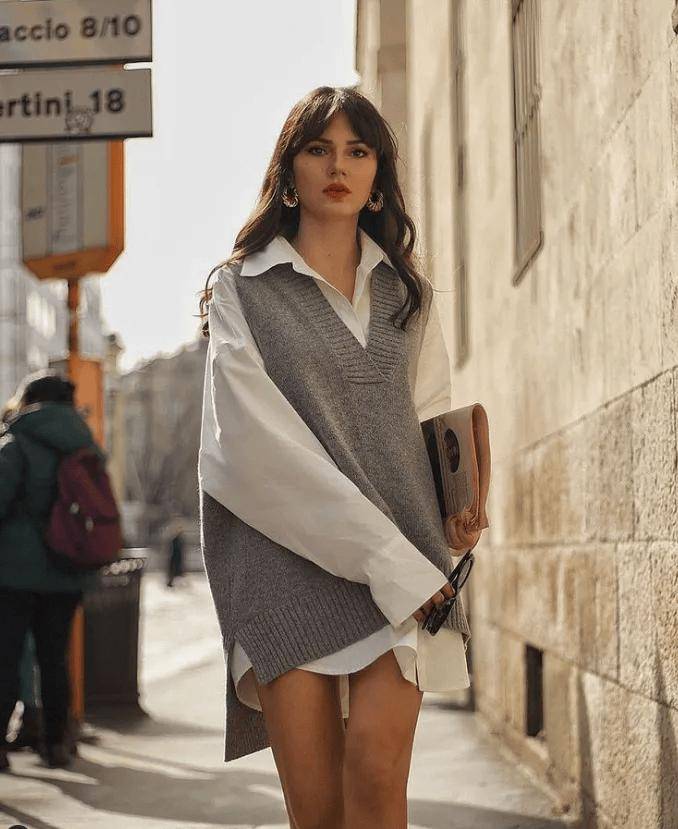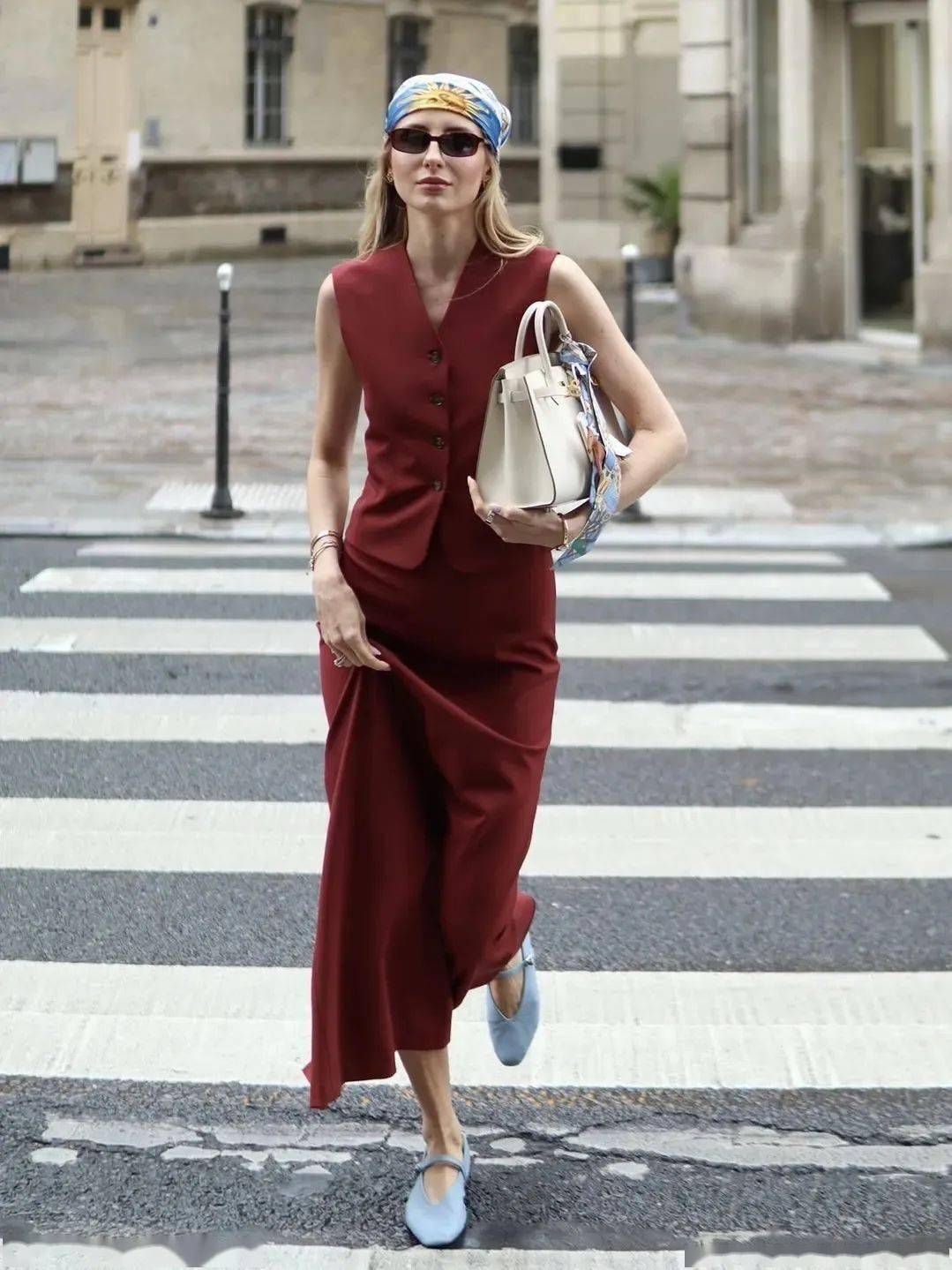 酒红色马甲+同色半裙:丝绒或针织材质的马甲与半裙套装,通过材质碰撞传递秋日暖意,内搭白色背心打破沉闷,营造复古知性氛围。
