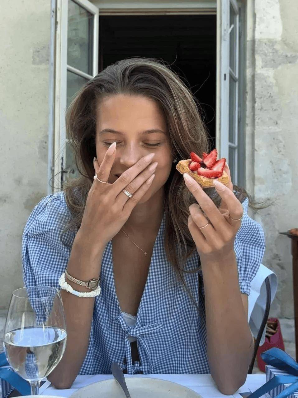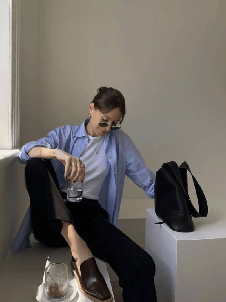 解开两颗纽扣的蓝色衬衫,与复古蓝牛仔裤构成同色系渐变,搭配咖色皮带点缀腰线,既有慵懒闲适的框架,又不失挺拔气场。这一组合堪称“永不过时的时髦公式”,无论是梨形或苹果身材,都能在宽松廓形中藏肉显瘦,轻松驾驭不费力的优雅。