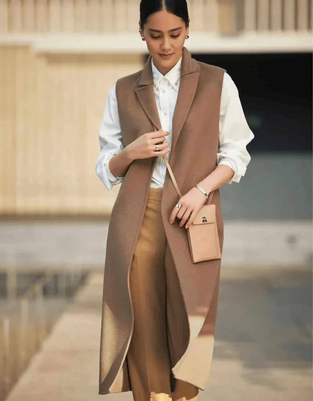 长马甲也可以叫马甲风衣、马甲大衣,搭配裙子或裤子都很耐看,既不出错,又能营造知性风与文艺复古感。