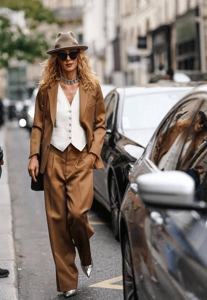 1. 灰色衬衫+咖色西装阔腿裤:都市漫步者的诗意叙事