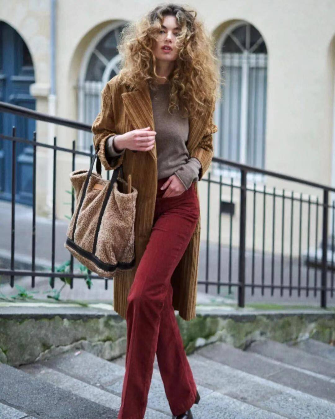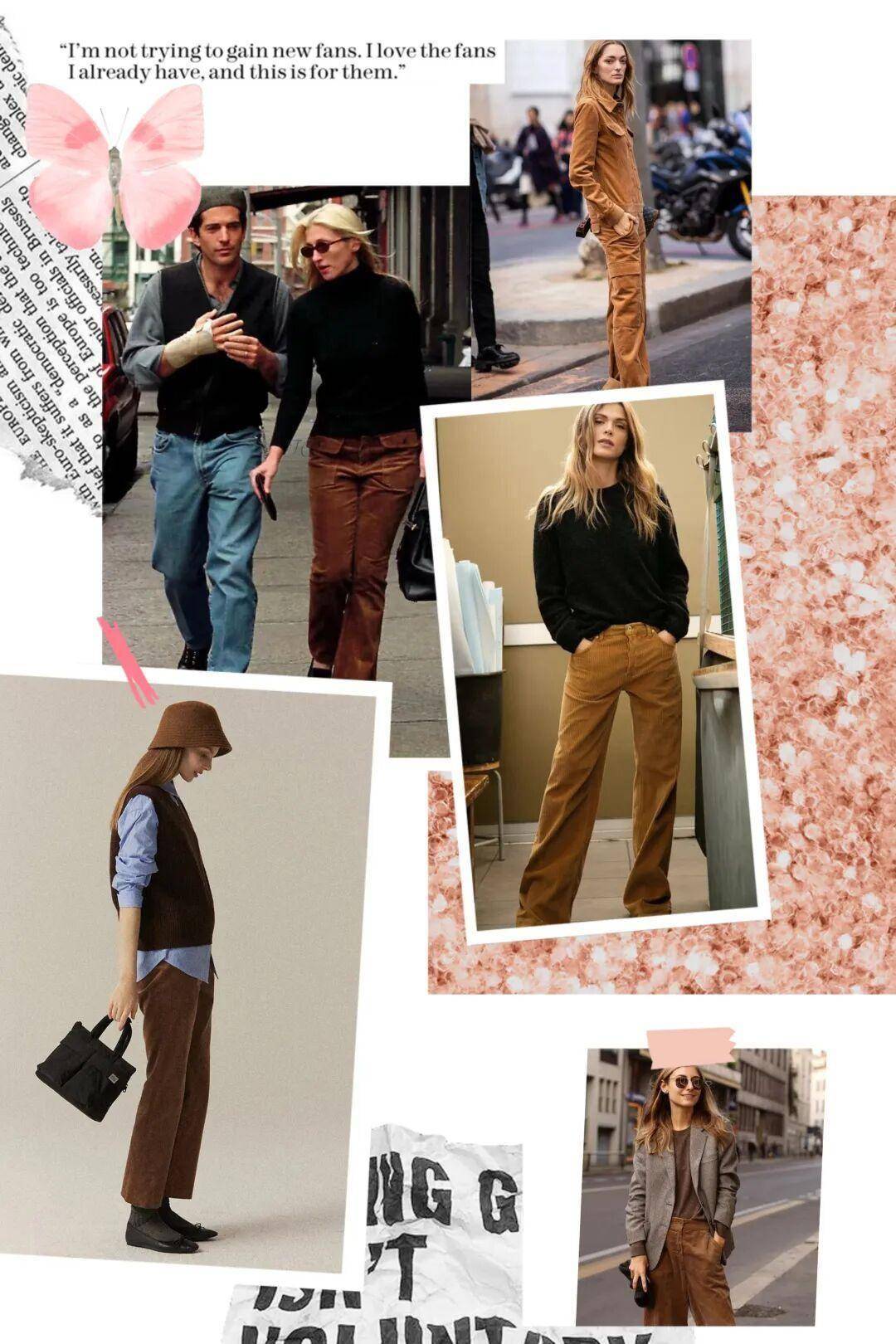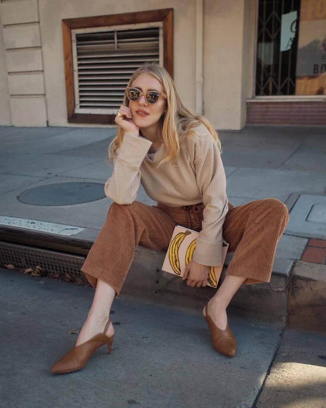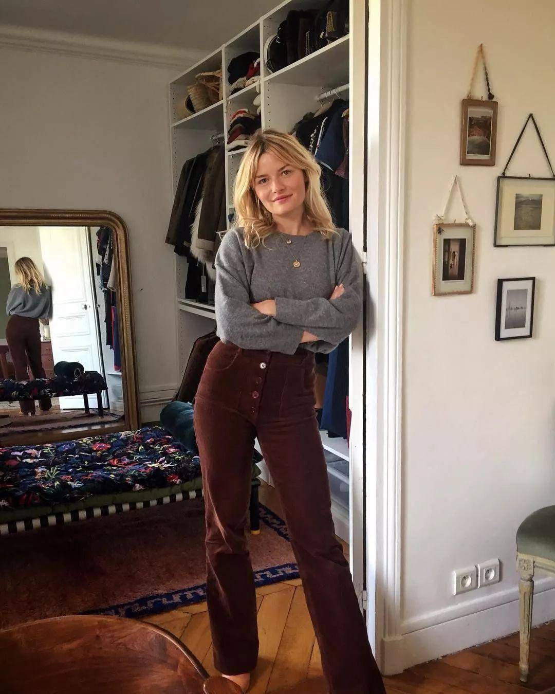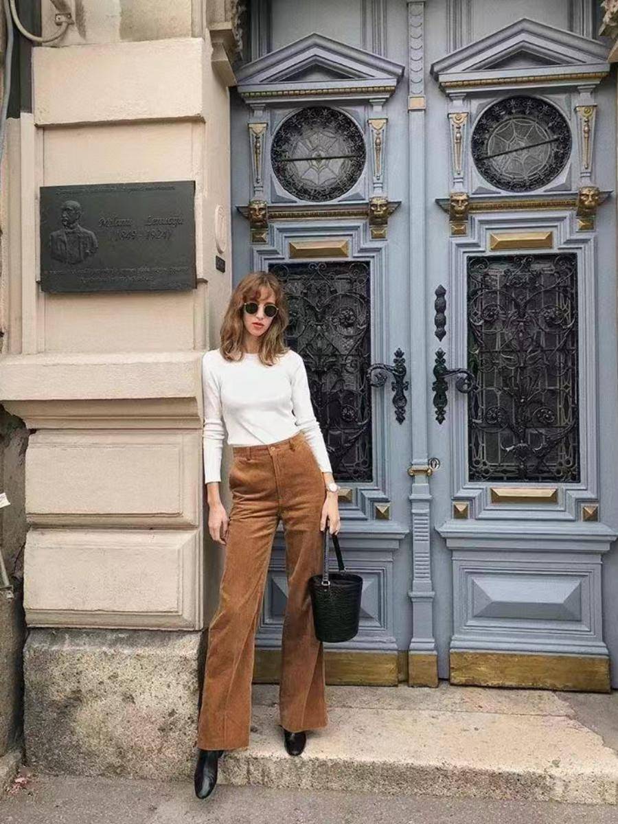 灯芯绒裤装是美拉德穿搭的 “入门款”,版型多选(直筒、奶奶裤、阔腿、微喇),适配各种上衣,还能悄悄优化腿型: