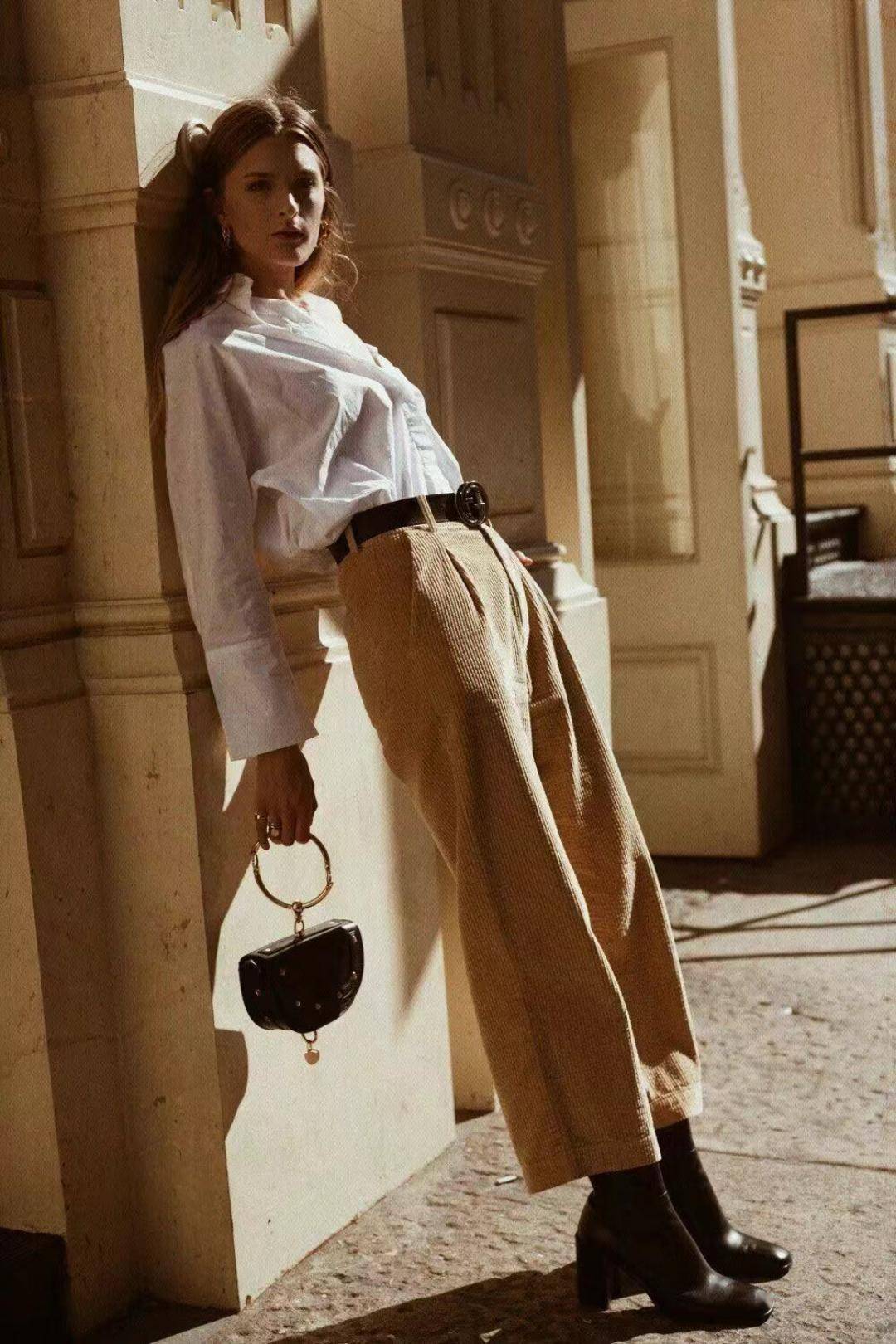 搭白衬衫:卡其色灯芯绒直筒裤 + 白色衬衫,衬衫塞进裤腰,系一条棕色皮带,复古中带点优雅,通勤穿不呆板,早秋单穿、深秋叠毛衣都合适;