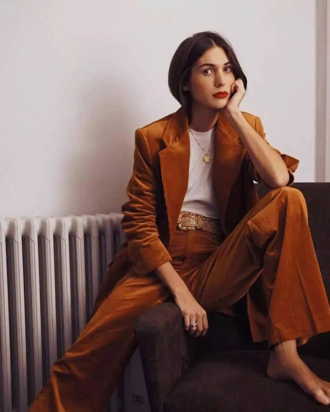 不局限同色:若怕全身同色显单调,可用 “相近色” 搭配 —— 比如浅卡其灯芯绒西装 + 深棕灯芯绒半裙,色系和谐又有层次,比同色更显穿搭功力,通勤、轻社交场合都能穿。