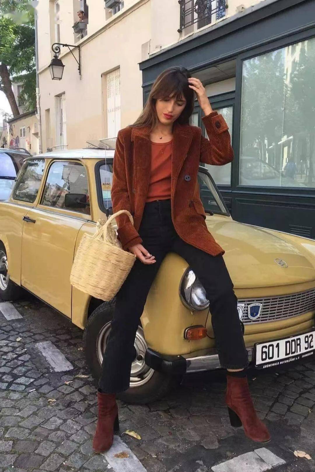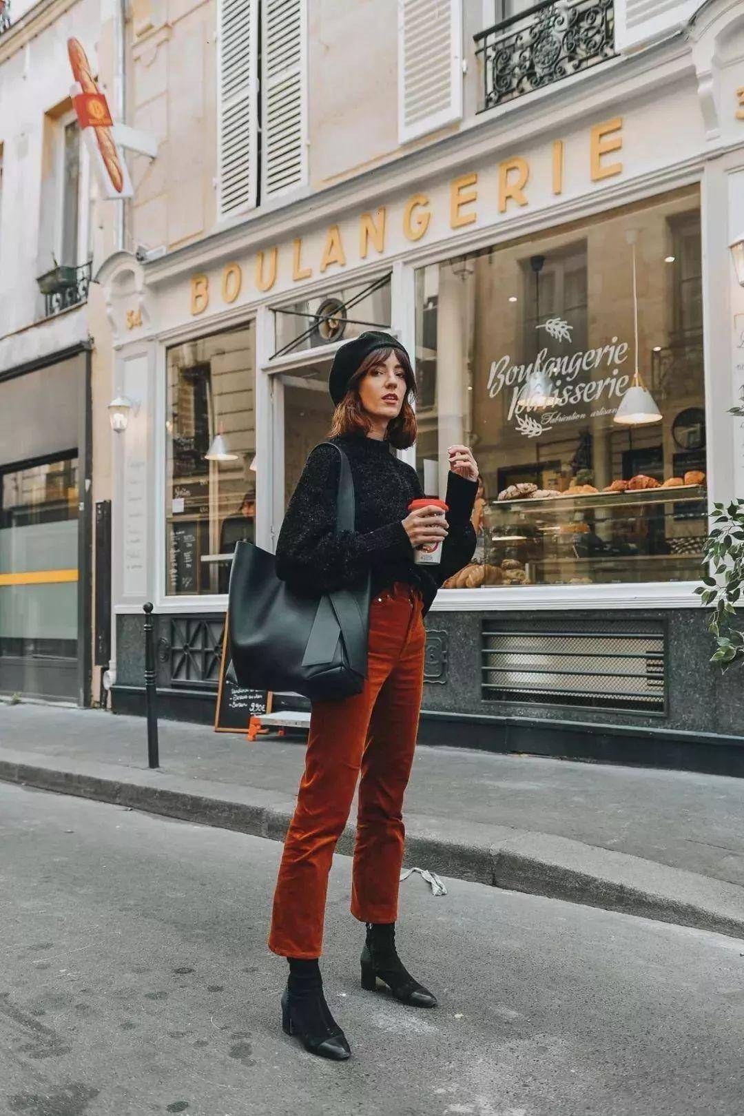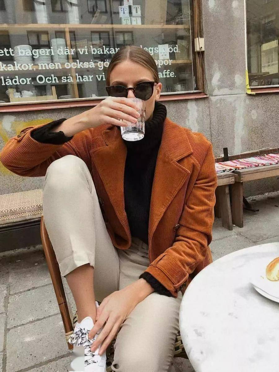 街头风搭法:深棕色灯芯绒外套 + 烟管裤 + 高领毛衣,外套敞开穿,露出毛衣领口,配马丁靴,又美又飒,适合喜欢酷感的女生。