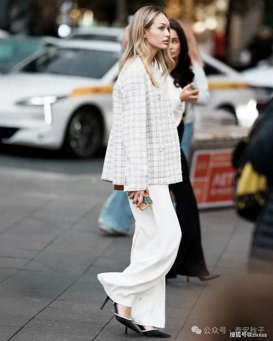 比如白色的小香风洒脱可以选择白色的阔腿裤来配,同一颜色的组合既有知性、高级的矜贵感,又不会显得太过隆重、避免了老气。