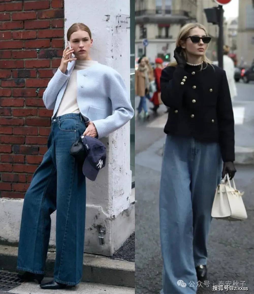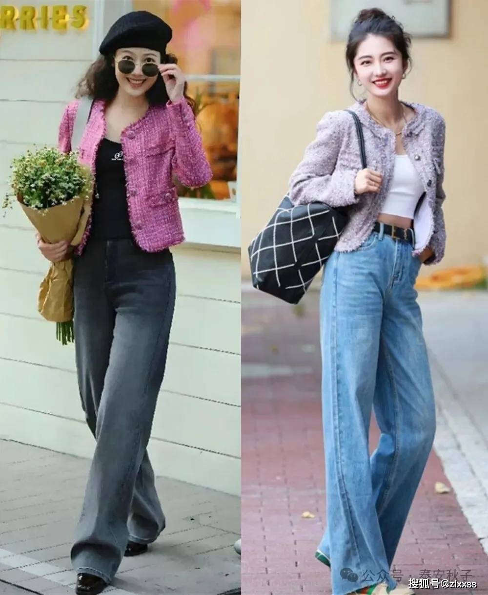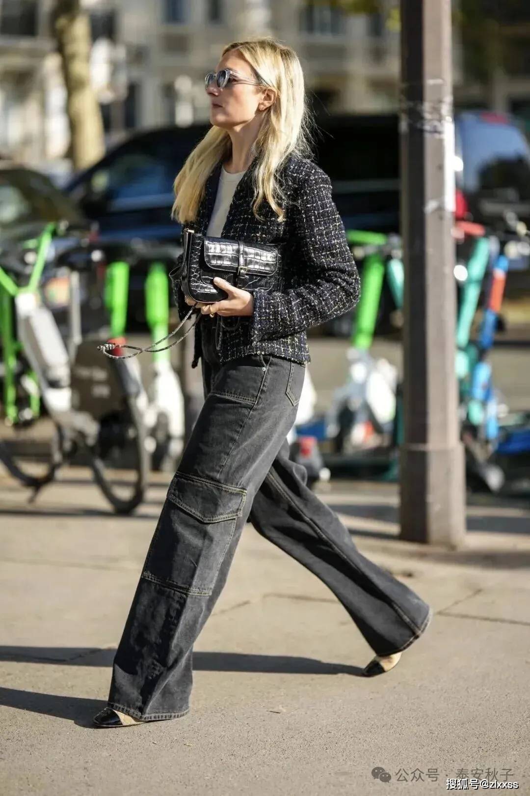 深秋时分可用黑色的小香风外套,去搭配怀旧的浅蓝色牛仔阔腿裤,不仅增加了一抹小清新的腔调,还减龄时髦超起范儿。