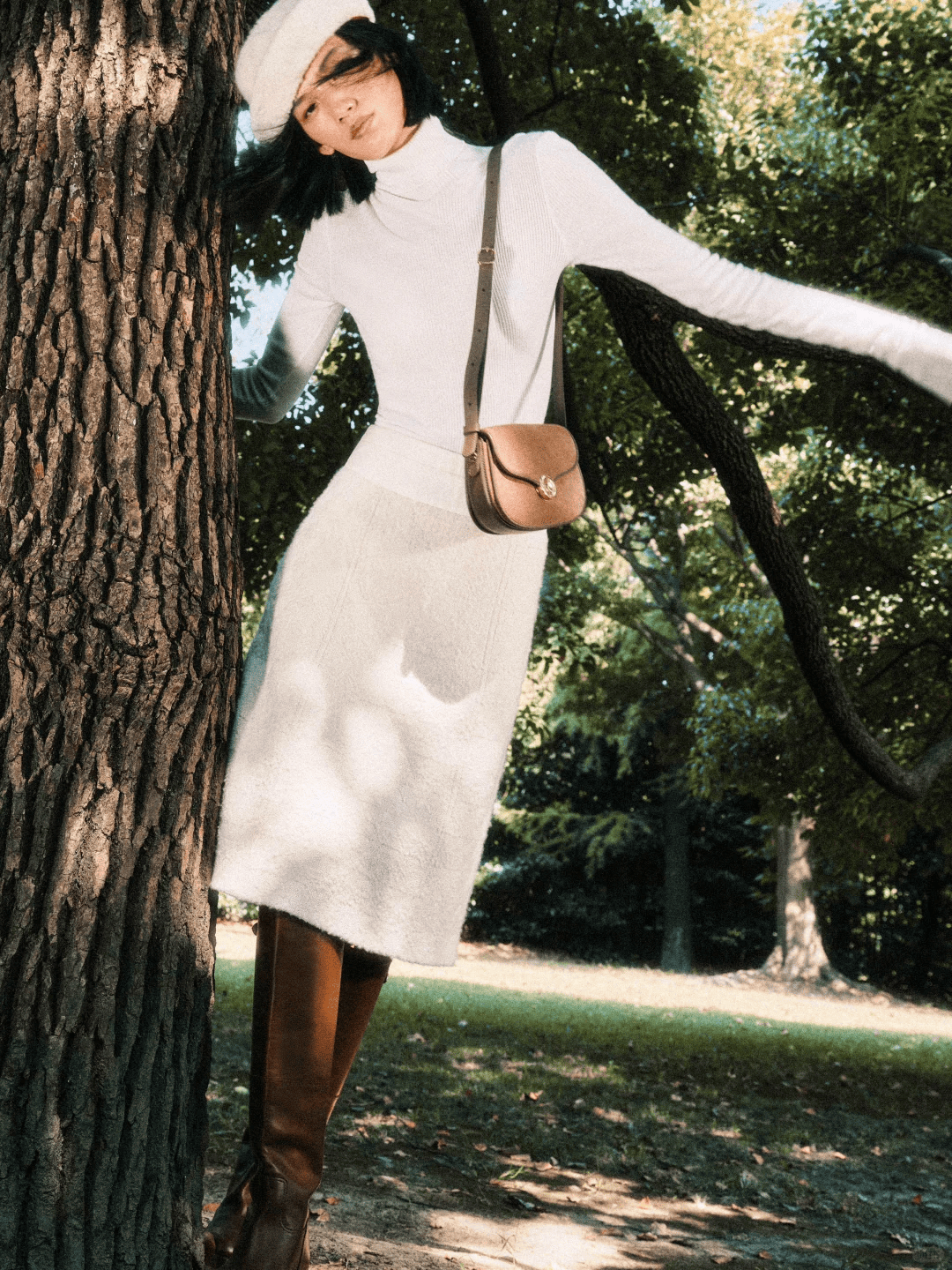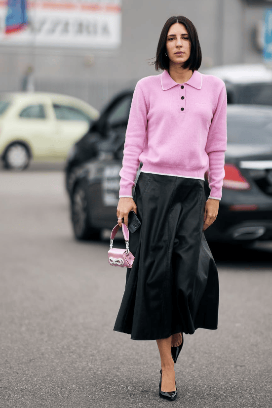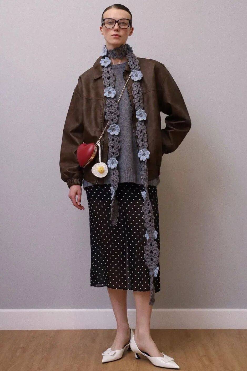 又或者搭配皮裙,无论是铅笔裙还是伞裙,各种颜色都能衬托被岁月温柔以待的知性美。