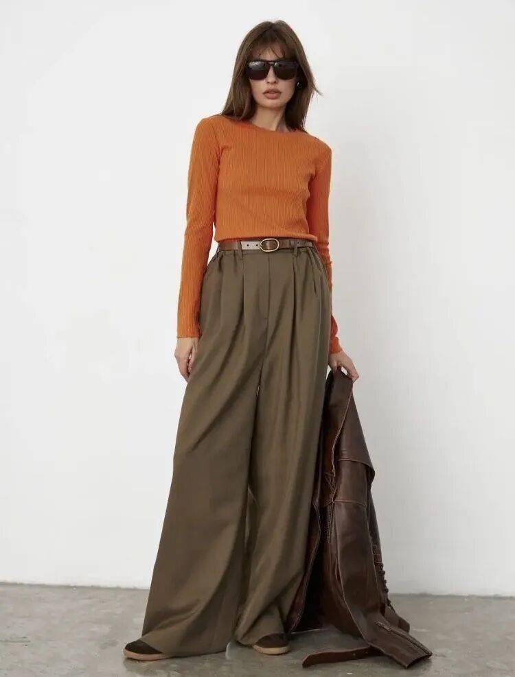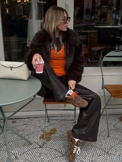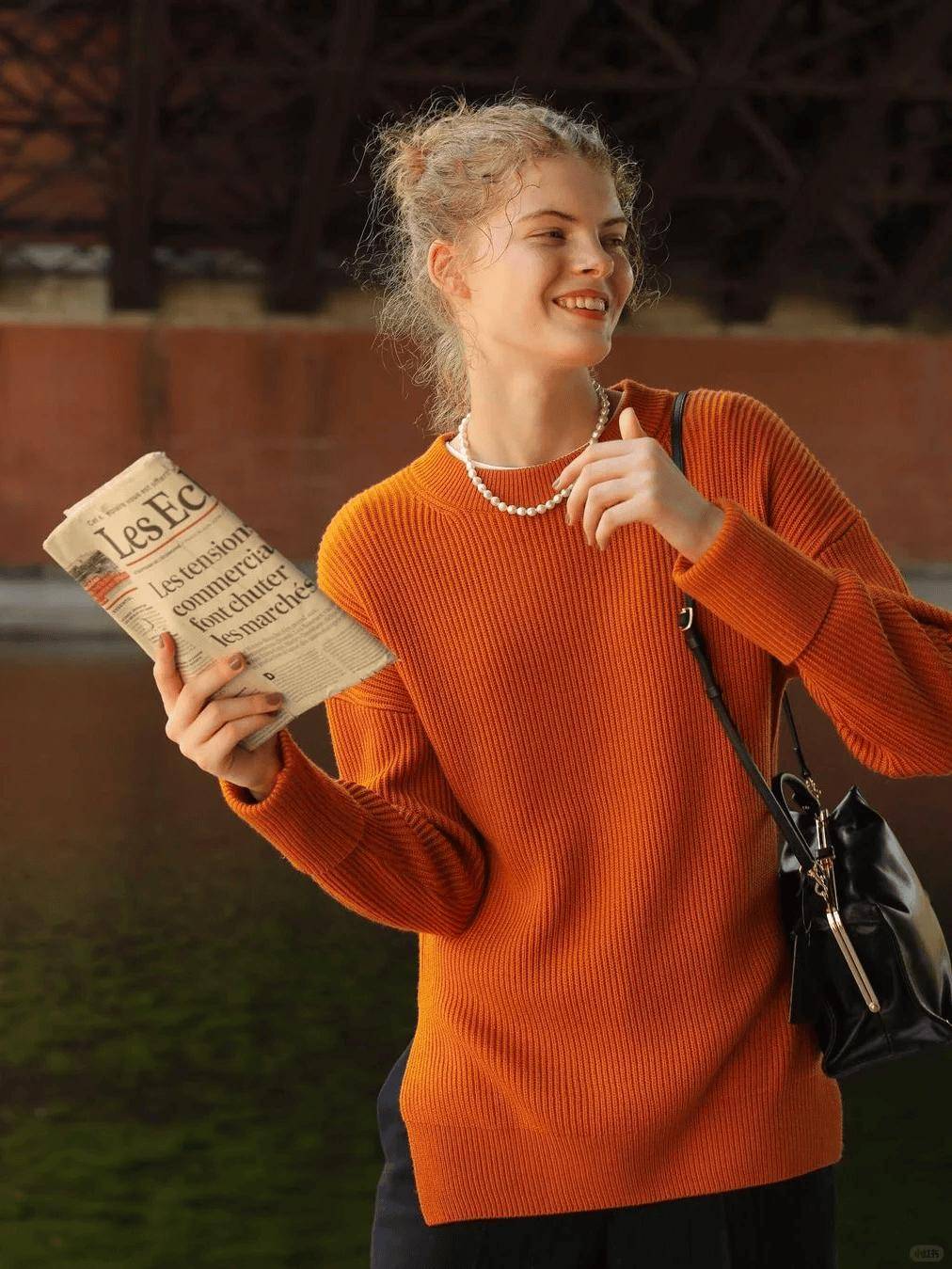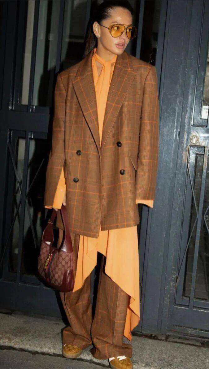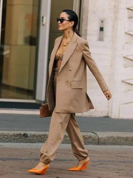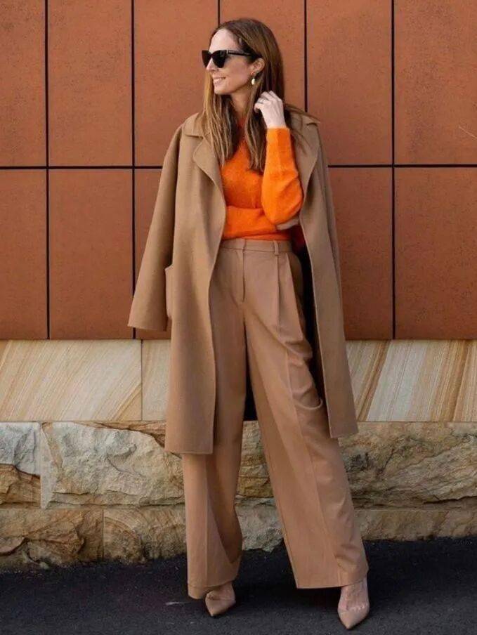 一件橙色毛衣或西装套装,用棕色作为调和,既保留橙色的明媚,又注入沉稳气场。浅橙色系对黄黑皮更友好,搭配棕色下装,显白提气,温柔不张扬。