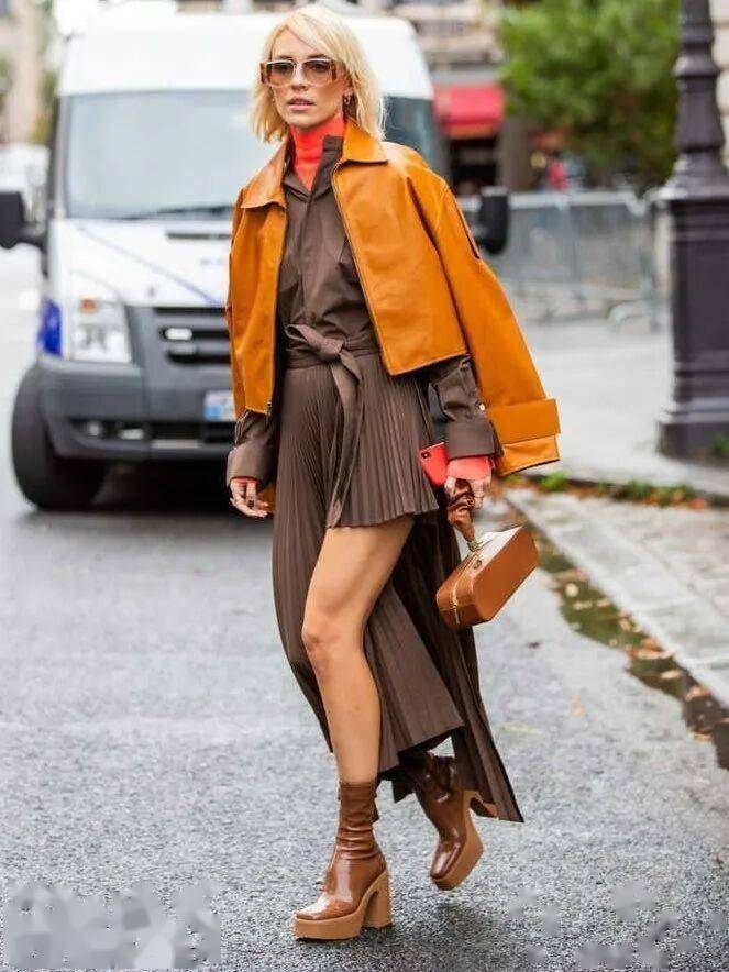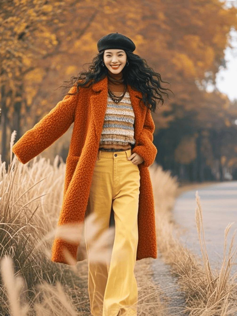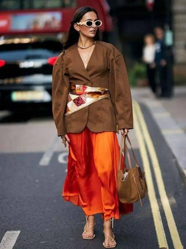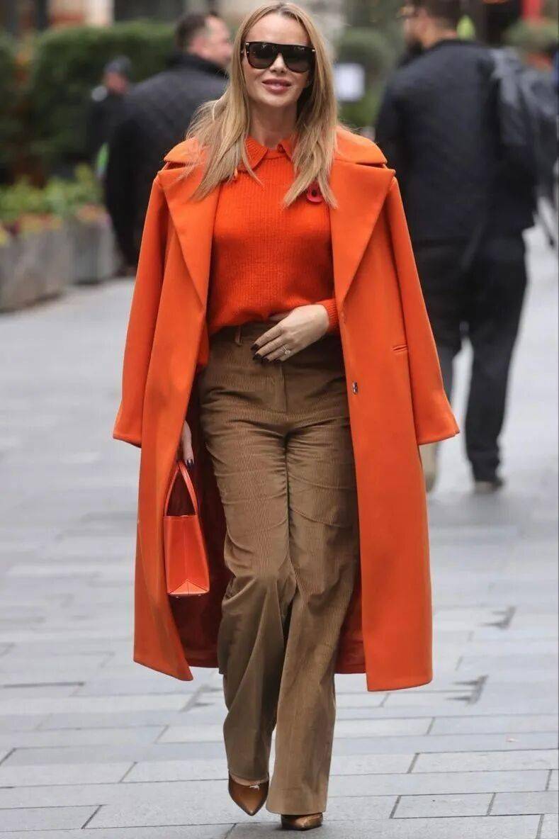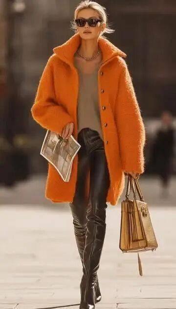 一件橙色长大衣,搭配棕色长靴或阔腿裤,是许多“橙色控”的冬日宣言。不妨在整体中加入一抹绿或一抹黄,激发色彩碰撞的戏剧感,让温暖与个性同时在线。