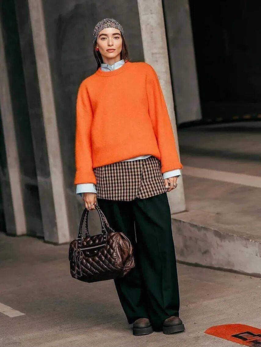 一件内搭,从橙色薄针织到橙色衬衫,只要你有棕色的外套单品,都可以试试10%的橙色运用。