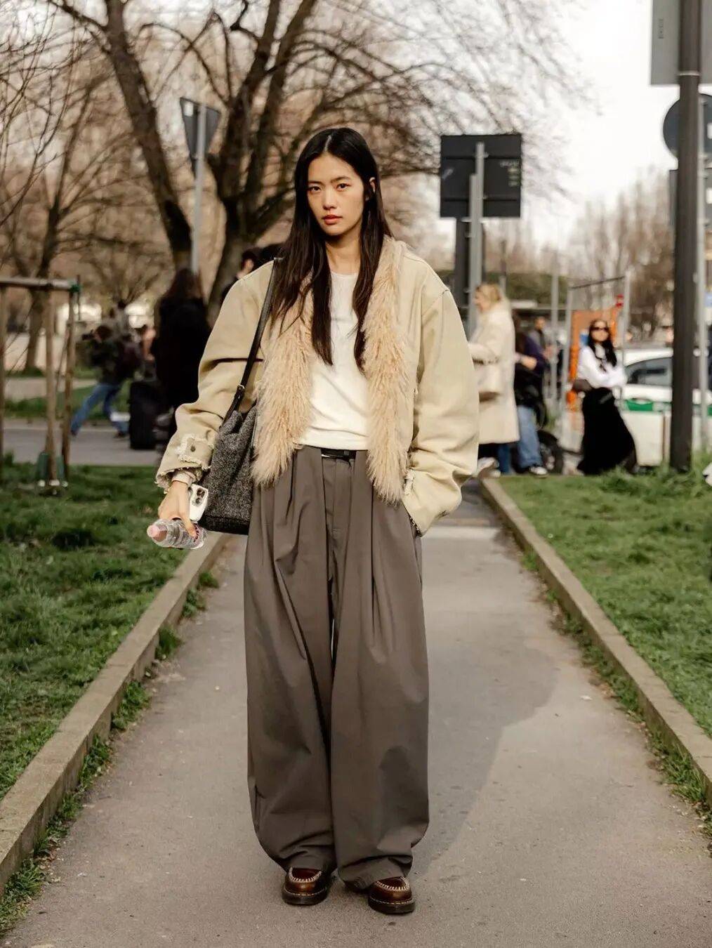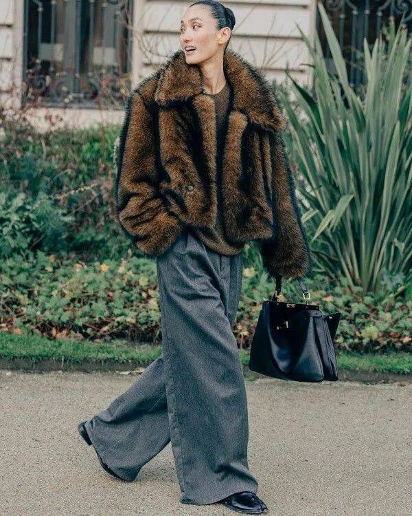 领口既有毛绒的视觉分量,上半身必须保持利落,才能让焦点集中在颈部。细针织或轻薄高领能让领口层次更清晰。