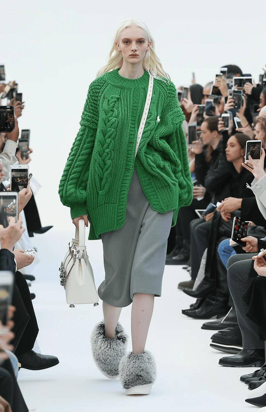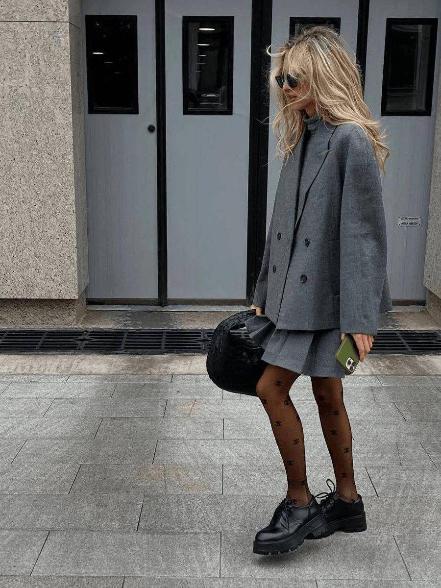 灰色是质感的放大镜。灰色的中立性,让它成为展现各类面料纹理的完美选择。无论是粗花呢的复古雅致、羊毛针织的细腻温暖,还是百褶裙的规律流光,在灰色的衬托下,这些纹理不被颜色遮盖,反而更加清晰、利落。