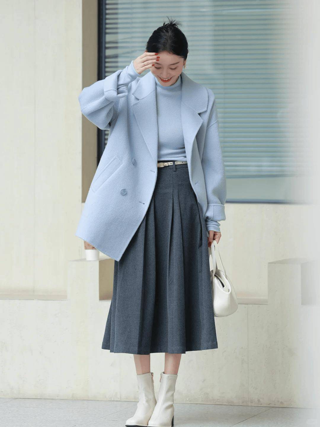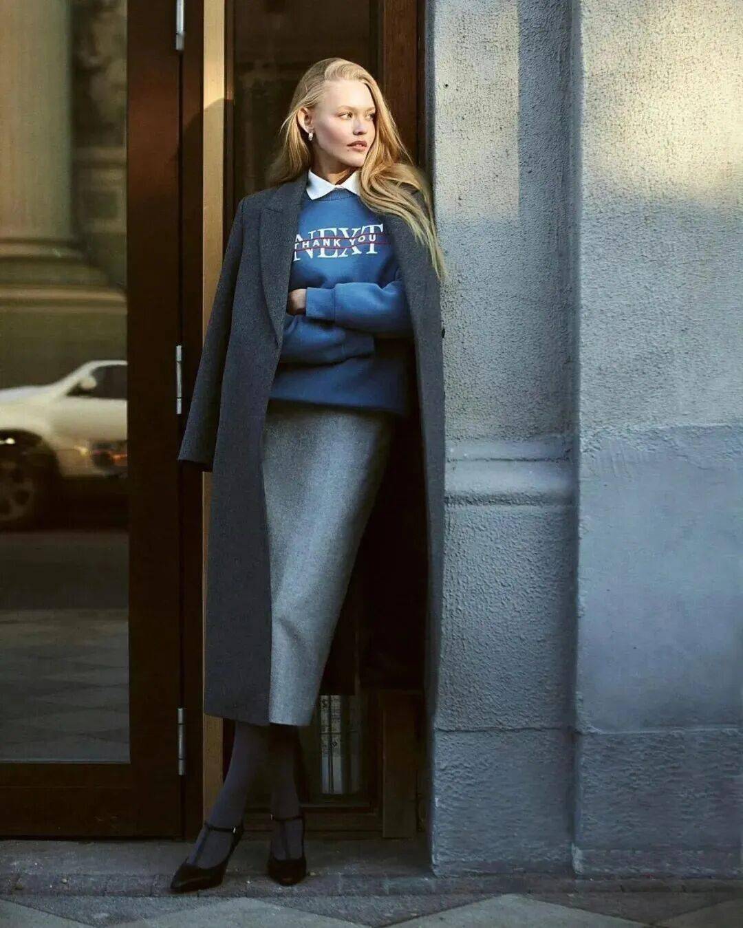 一件质感一流的灰色毛呢大衣,搭配一条灰色铅笔裙。内搭一件蓝色卫衣,静立那里便是一幅画,蓝色赋予深度与宁静,灰色赋予理性与优雅。
