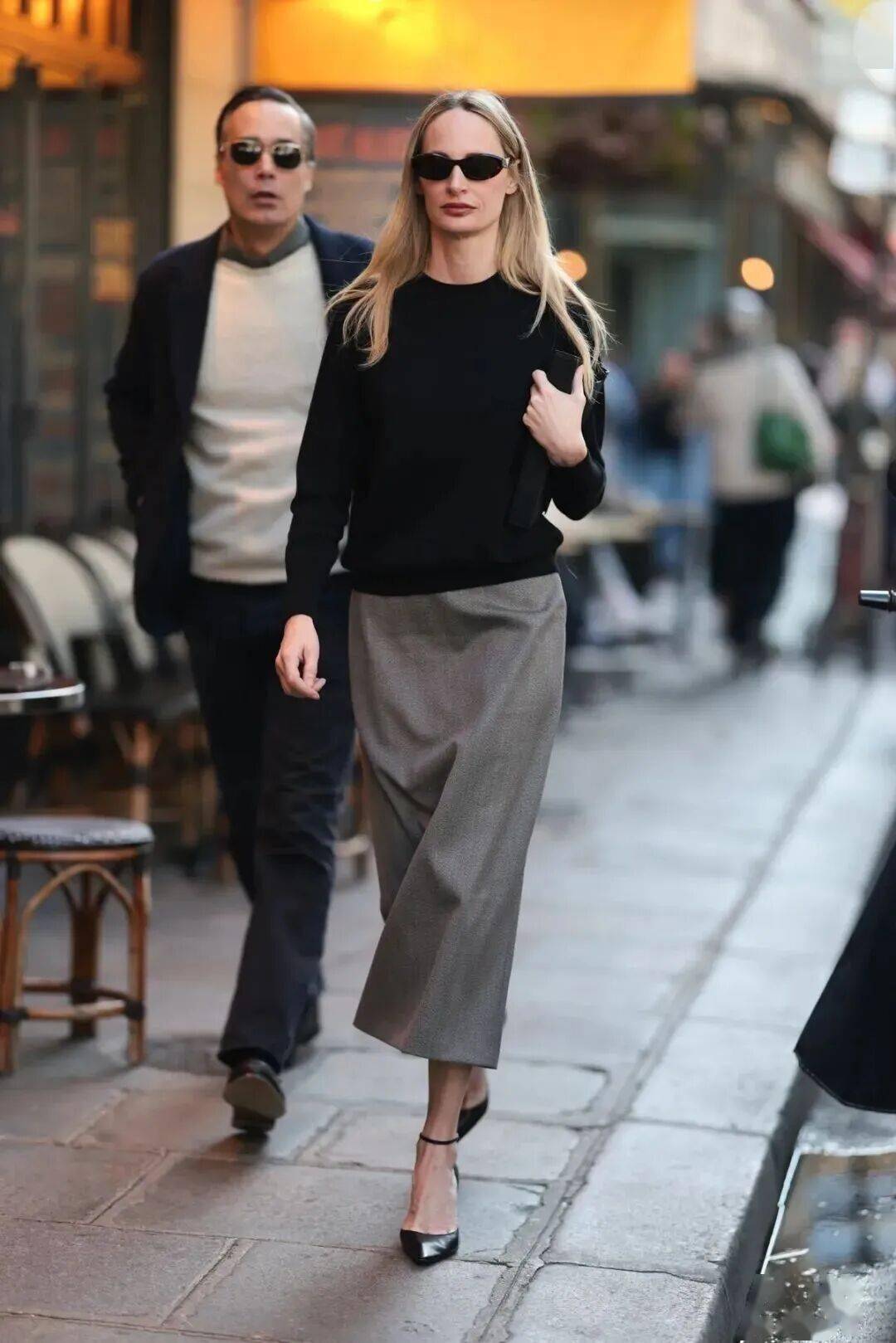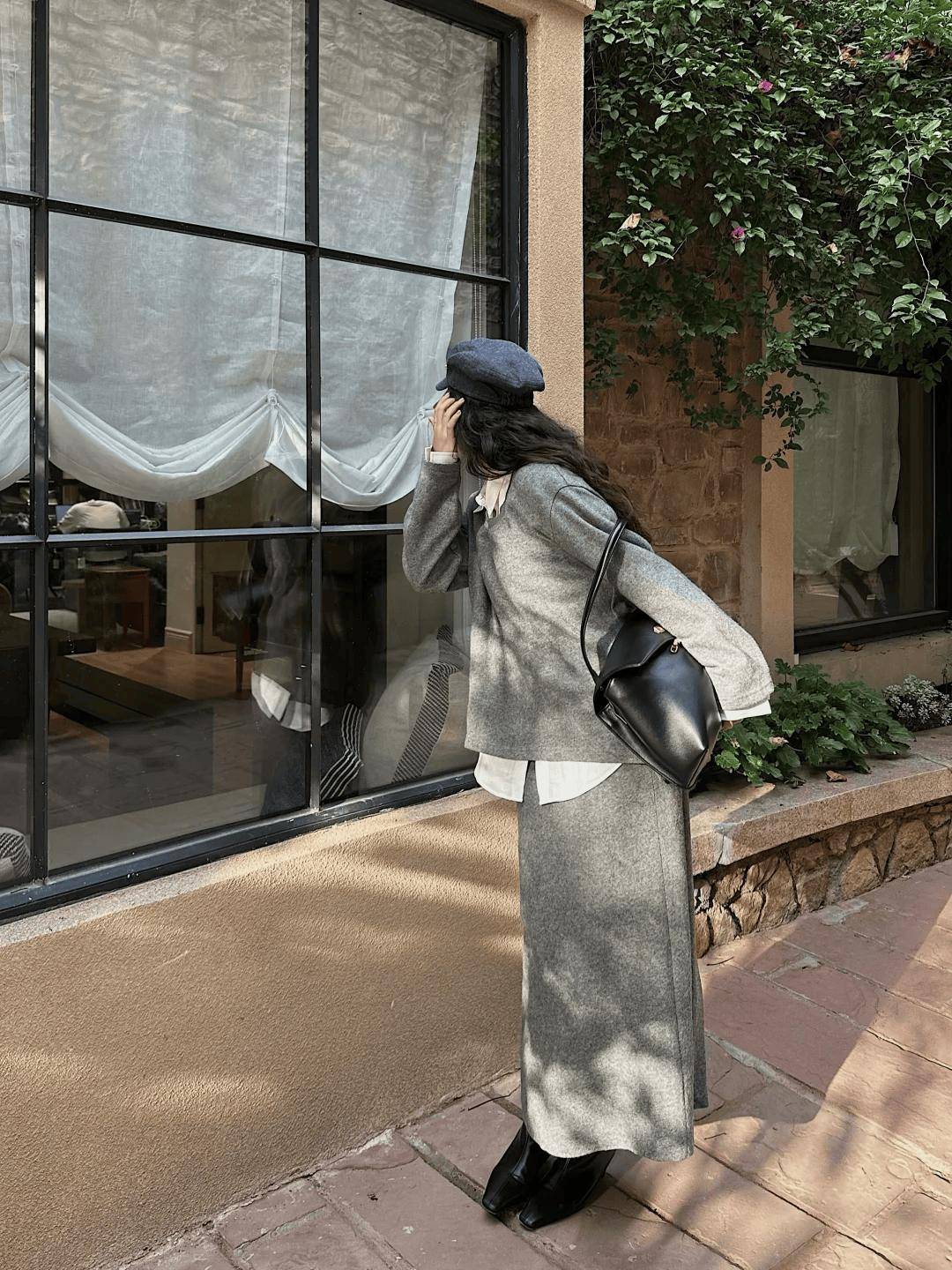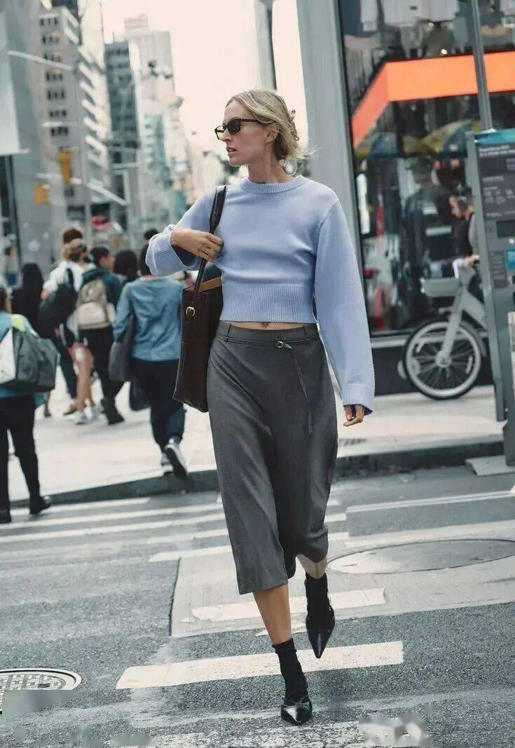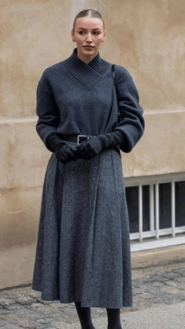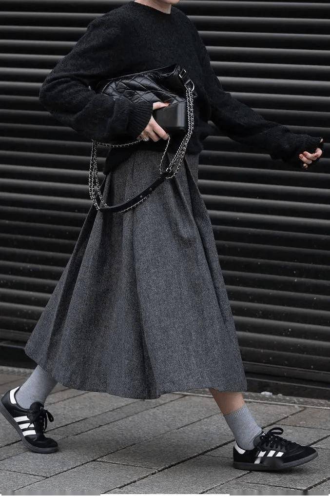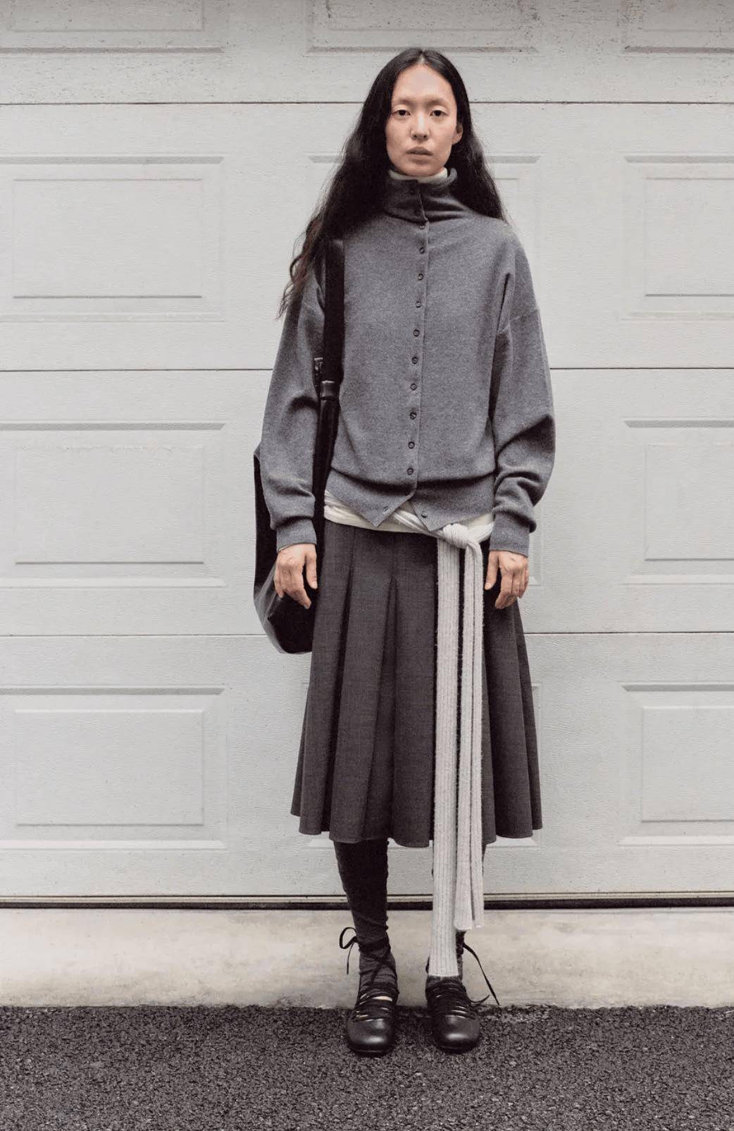 羊绒衫+羊毛半裙的搭配,可以通过材质对比营造出“近看才知究竟”的奢华。同样是灰色,羊绒的糯软光泽与羊毛的哑光质朴形成微妙对比,这在灰色的统一色调下激烈碰撞,结构感极强。
