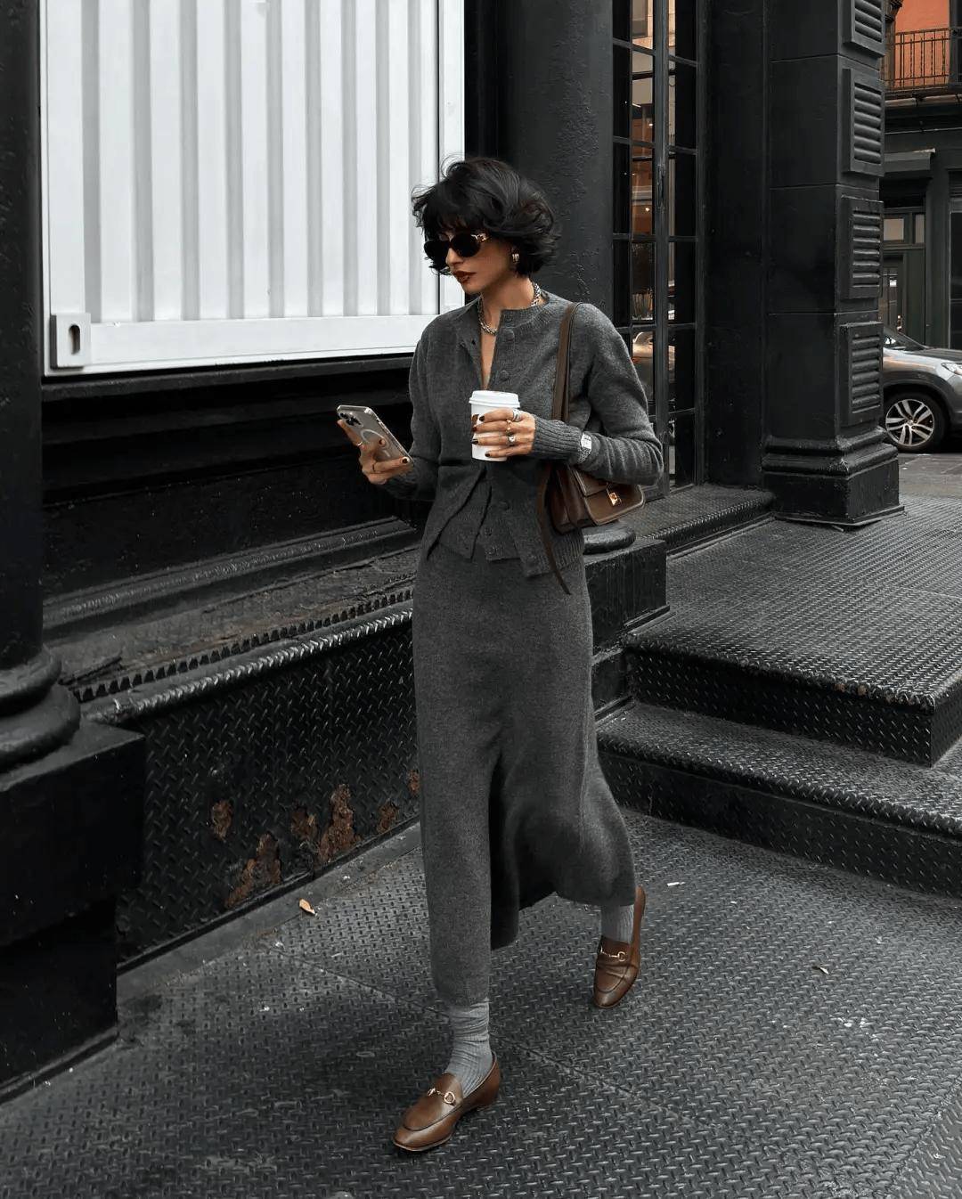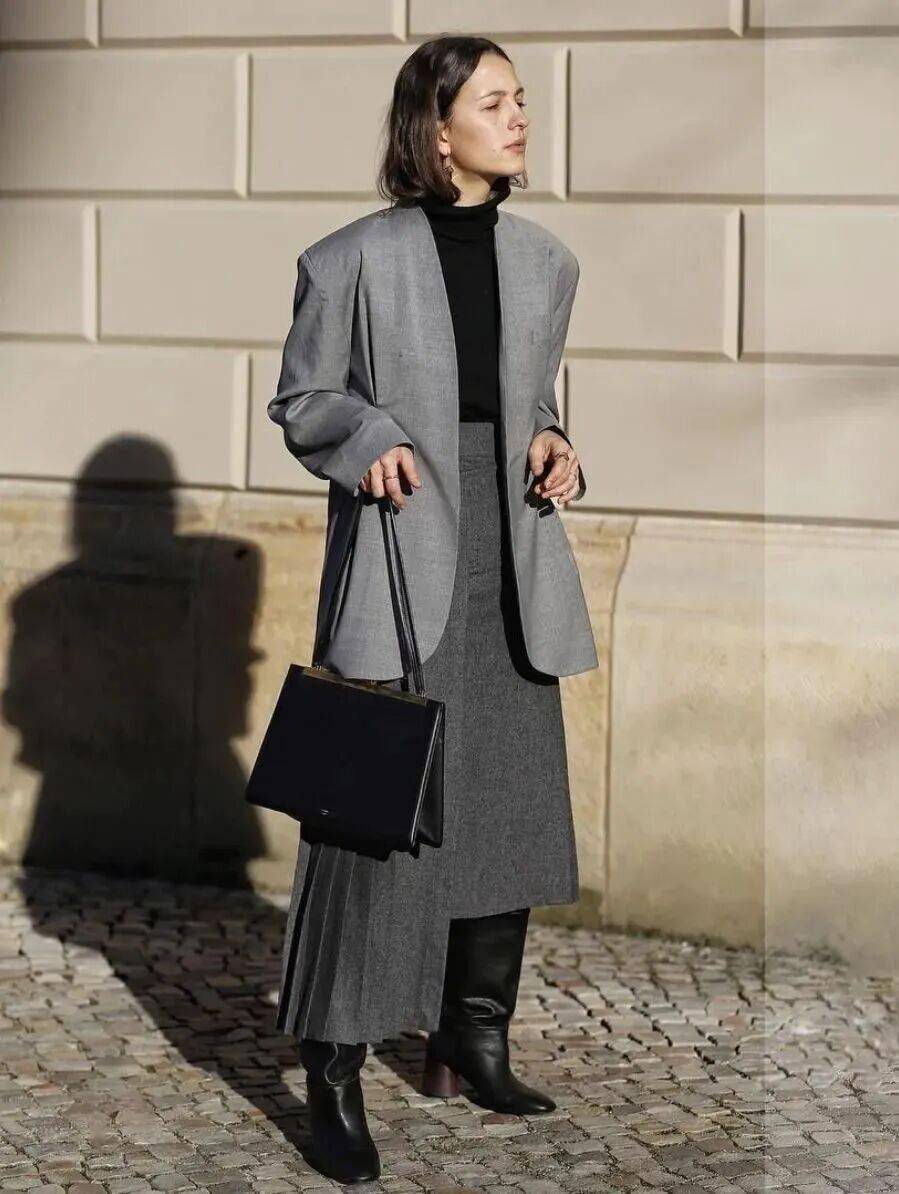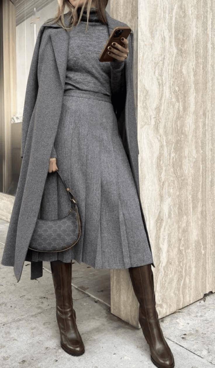 同色系搭配是展现高级感的绝佳方式。灰色是演绎同色系穿搭的绝佳载体,一条灰色半裙可以与不同深浅的灰色上衣相呼应——从烟雾灰的毛呢外套到炭灰色的针织开衫。