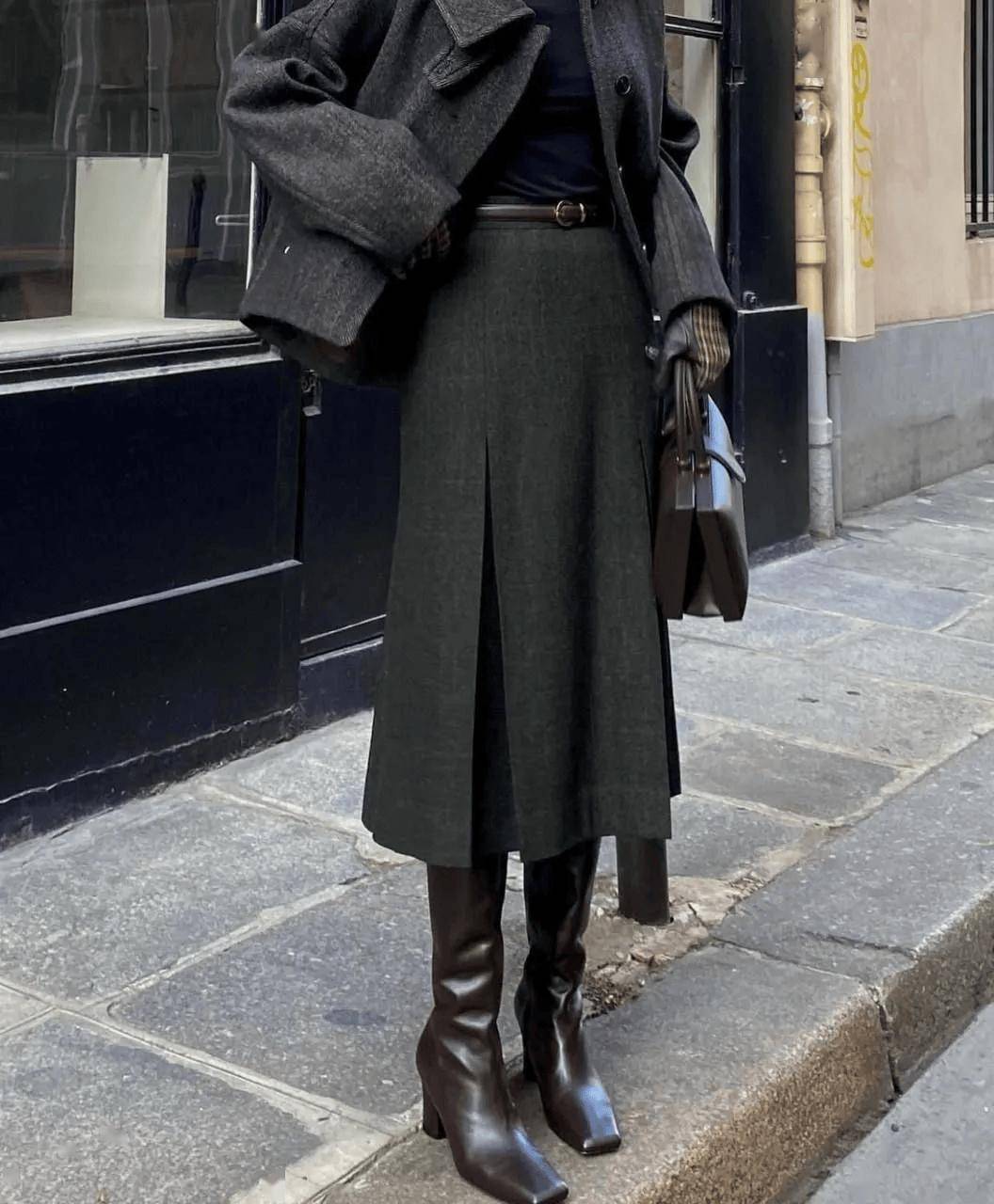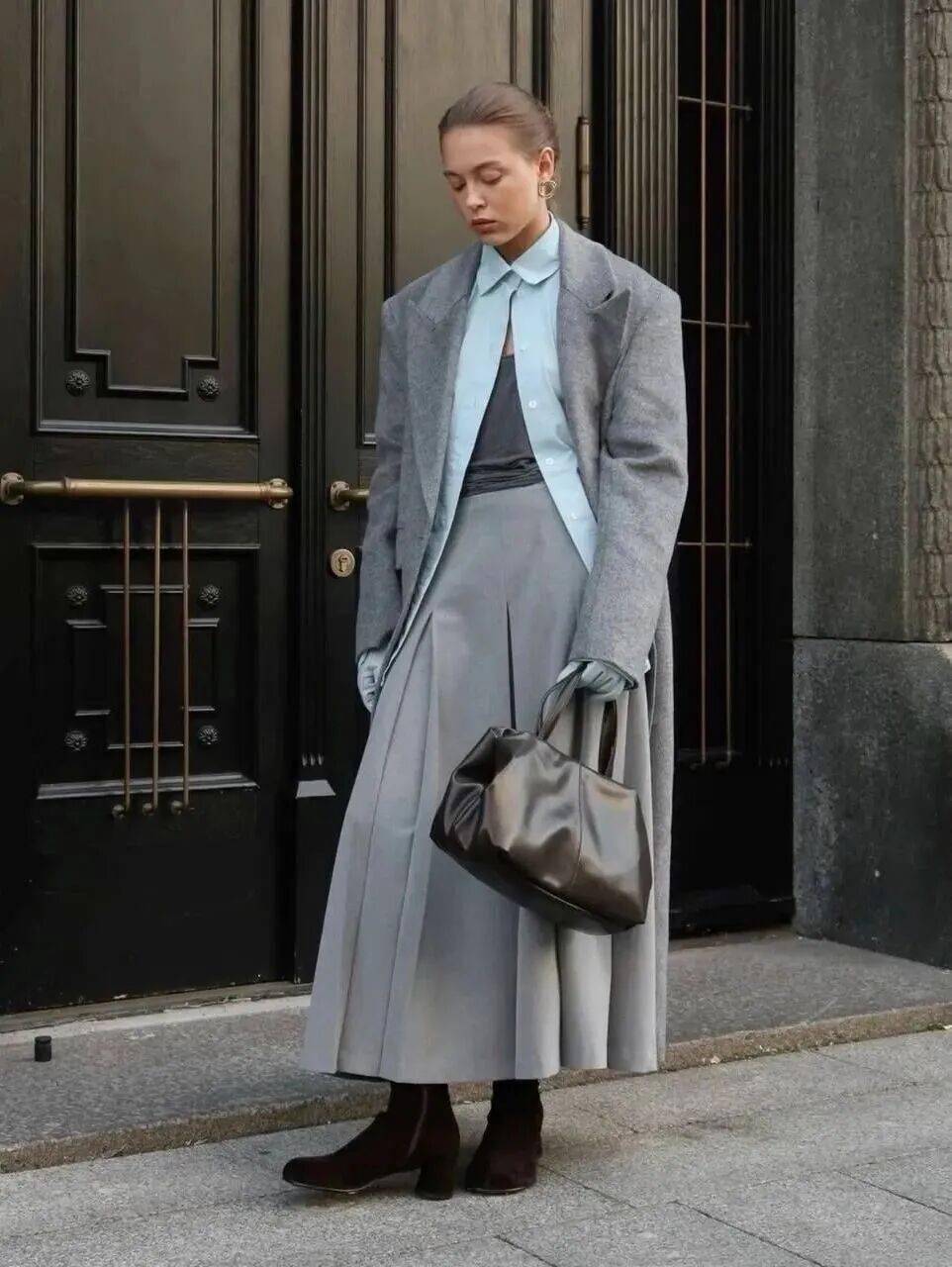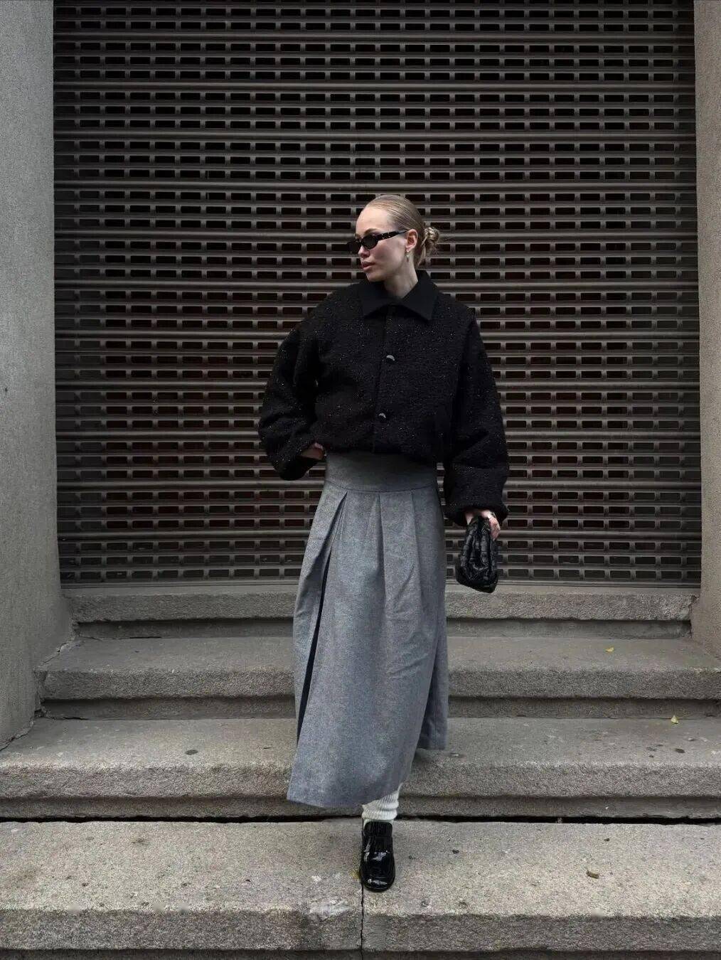同色系搭配是展现高级感的绝佳方式。灰色是演绎同色系穿搭的绝佳载体,一条灰色半裙可以与不同深浅的灰色上衣相呼应——从烟雾灰的毛呢外套到炭灰色的针织开衫。
