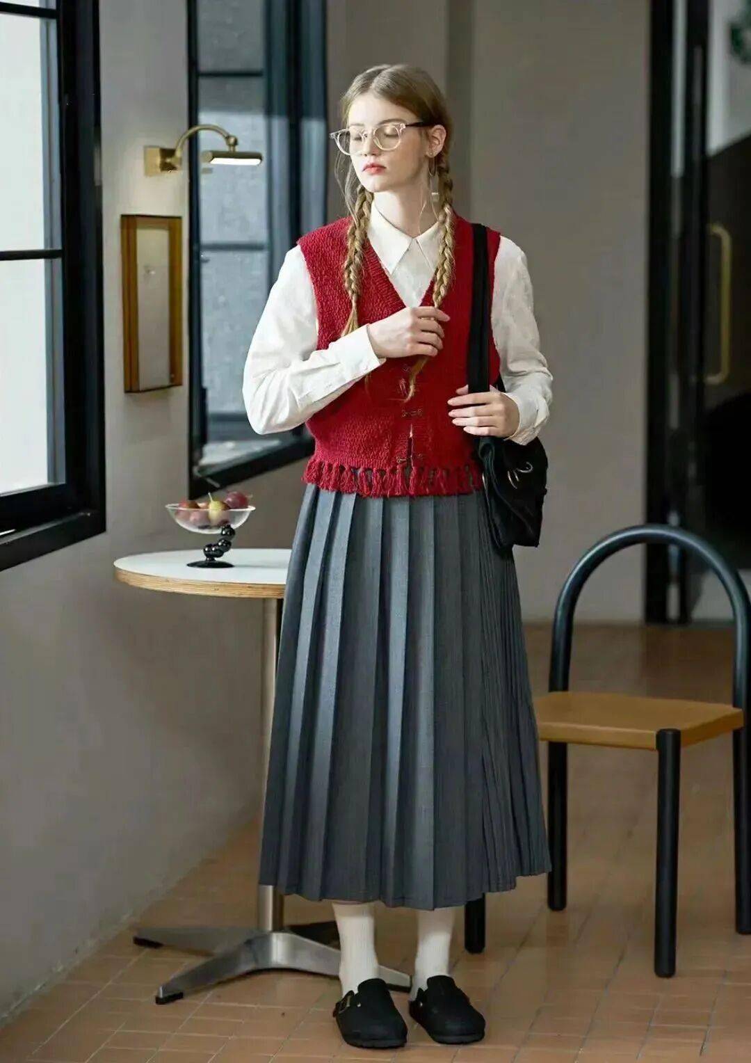 红色马甲足够吸睛,打破白衬衫 + 灰百褶裙的沉闷,自带元气与活力;利落的剪裁既能优化身材比例,又能增加造型层次感,避免基础款的单调。
