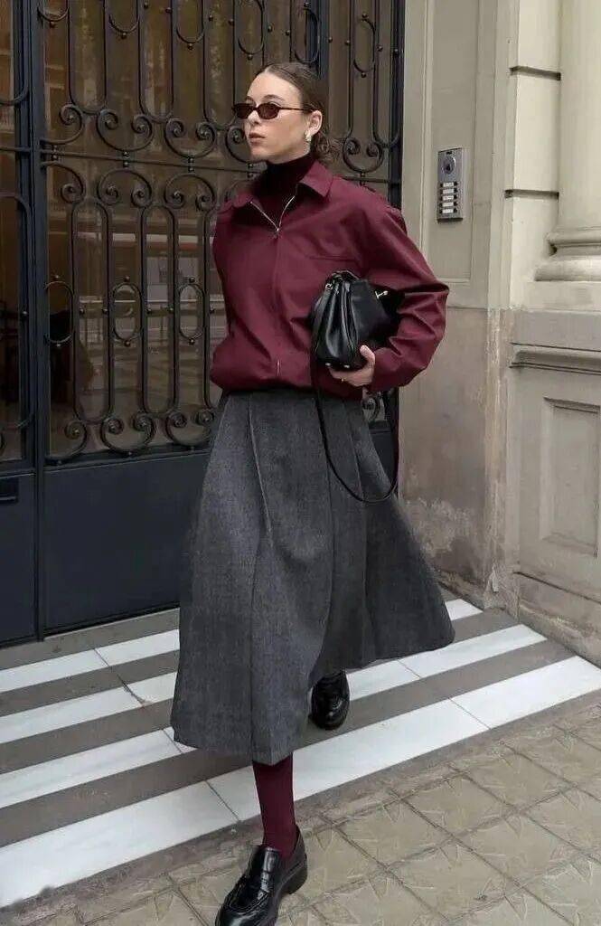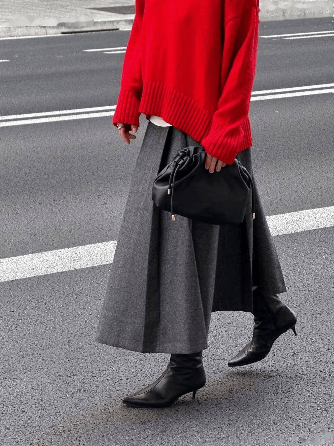 灰色半裙与红色系的搭配则展现出“热烈的冷静”。红色大胆、耀眼、充满情绪,而灰色半裙的存在,正是为了“驯化”这份张扬。